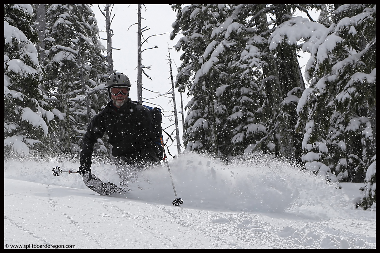The plan was to meet Dan, Joe and John at the patrol shack at 8:30 am in time to catch the 9:00 am chair. I woke extra early in the morning, hoping to get out with the camera and snap a few shots somewhere along the way to the Pass before making turns. There was lots of water in the side creeks along Highway 58 due to the recent rainfall, but I decided to try to get a decent picture of Salt Creek Falls. Arriving at the snow park to find the road still gated, I walked down the snow covered road for about 15 minutes to the falls, found a suitable overlook that offered the best vantage point for a picture, setup up the tripod, and snapped some photos. There was a variable wind that, along with the falling snow made it challenging to get a good exposure around 2 seconds, but the below picture turned out ok.