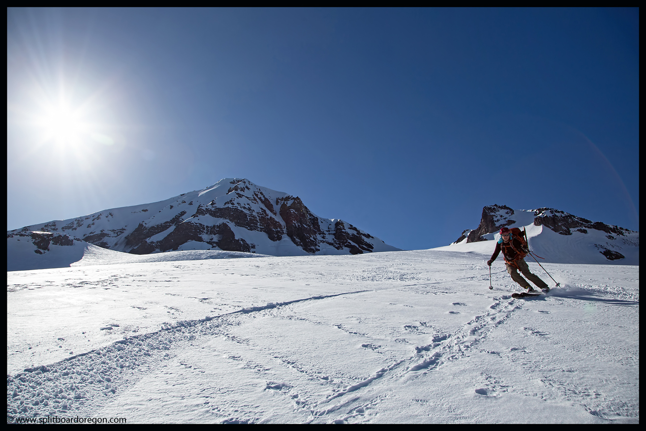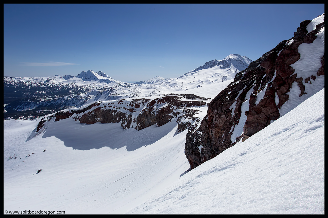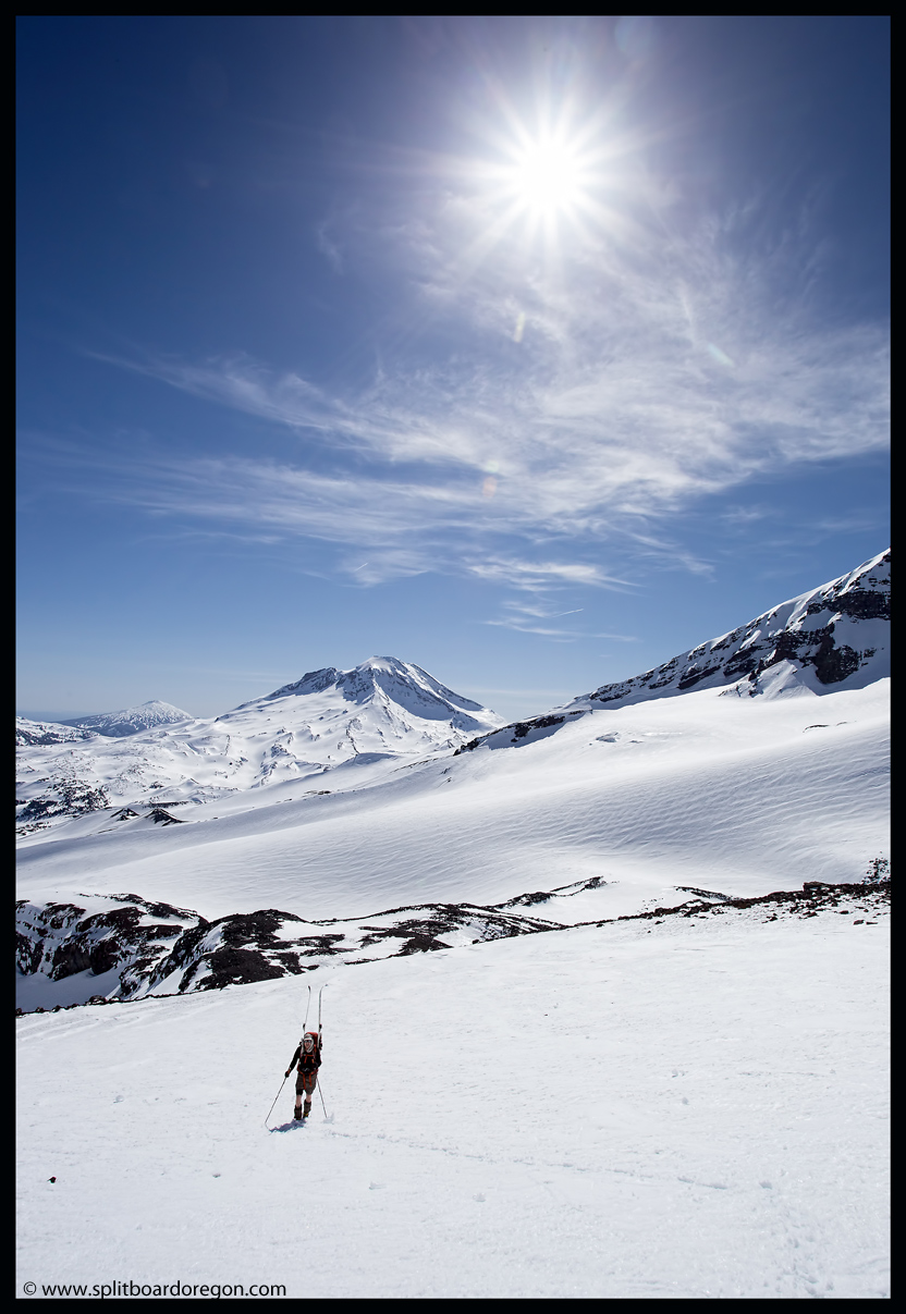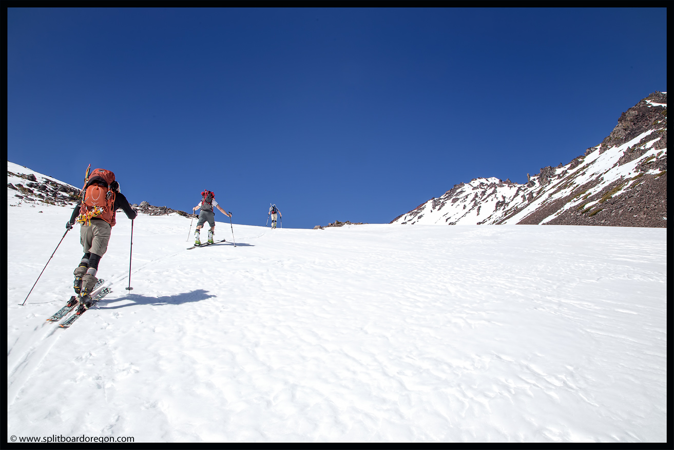 Rather than skin up the Hayden Glacier as I’ve done on previous trips, we elected to stay north of the Hayden and climb along the base of the southeast bowls of the North Sister. As we gained more elevation, the views became increasingly better. Below are a couple of shots of the crew skinning up as well as looking out across the flats towards South Sister….