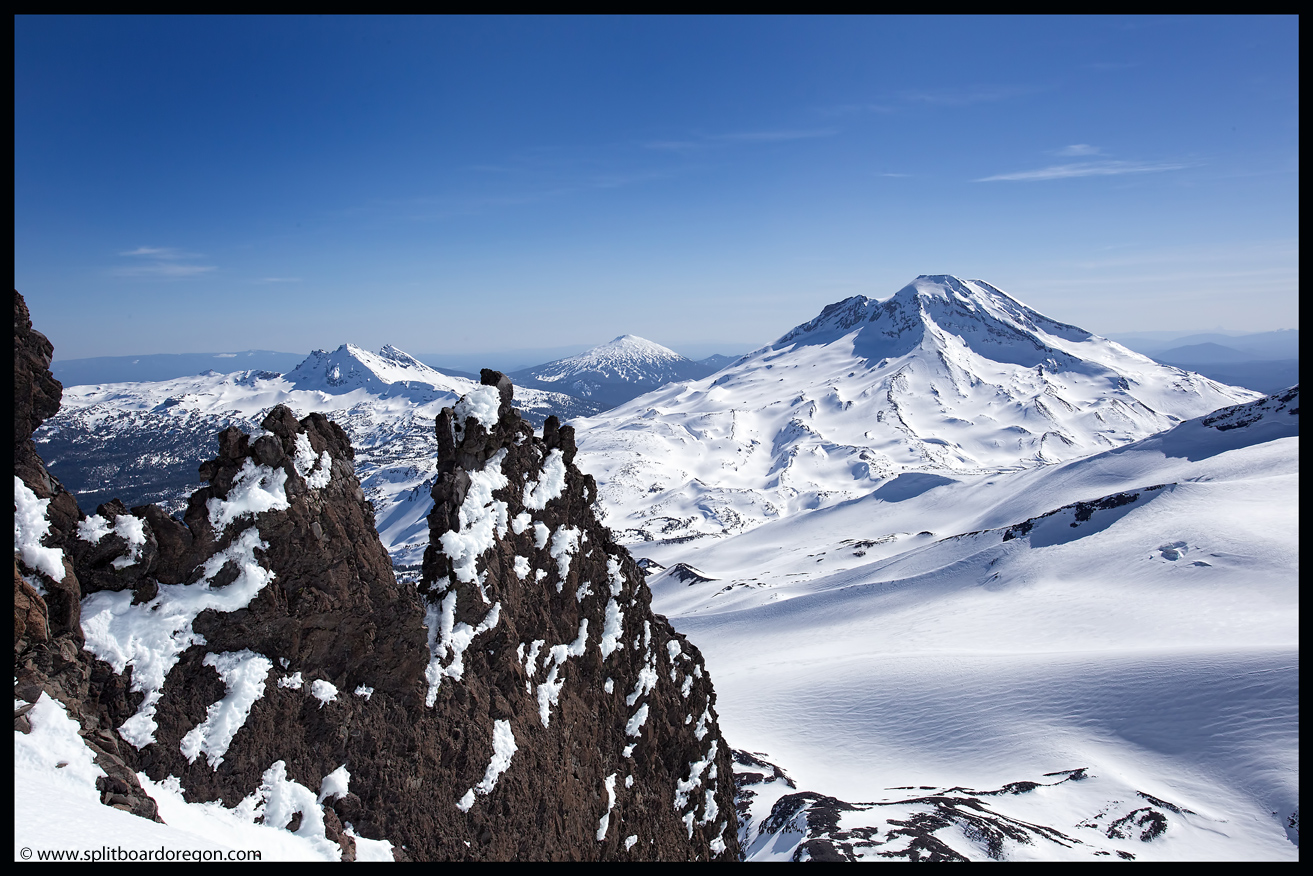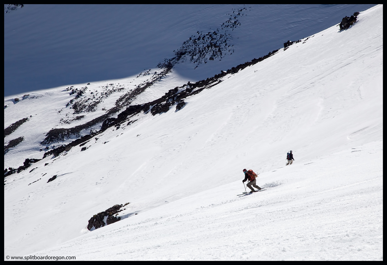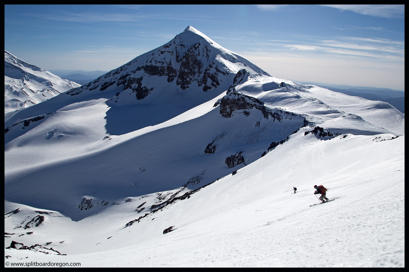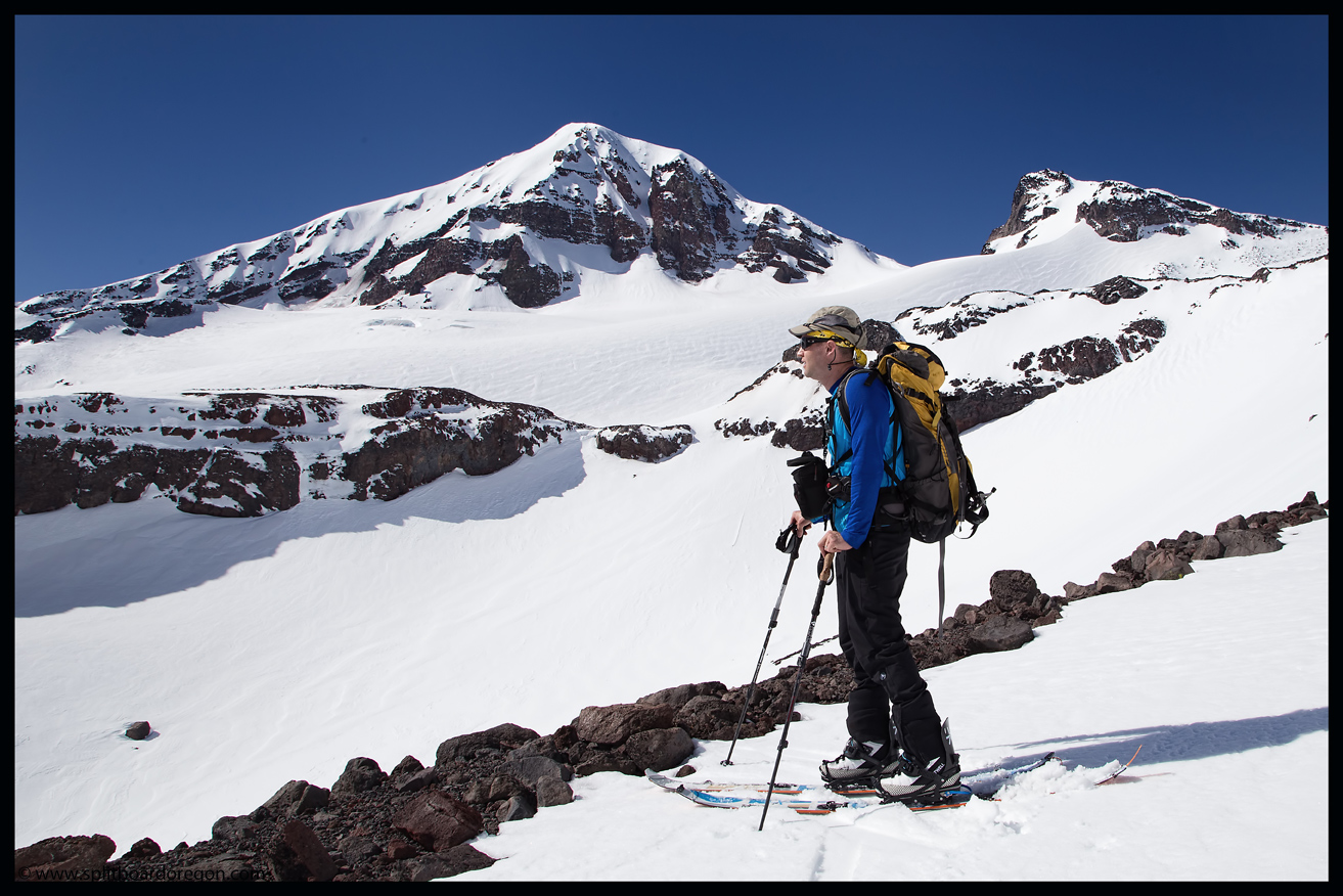 Rather than skin up the Hayden Glacier as I’ve done on previous trips, we elected to stay north of the Hayden and climb along the base of the southeast bowls of the North Sister. As we gained more elevation, the views became increasingly better. Below are a couple of shots of the crew skinning up as well as looking out across the flats towards South Sister….