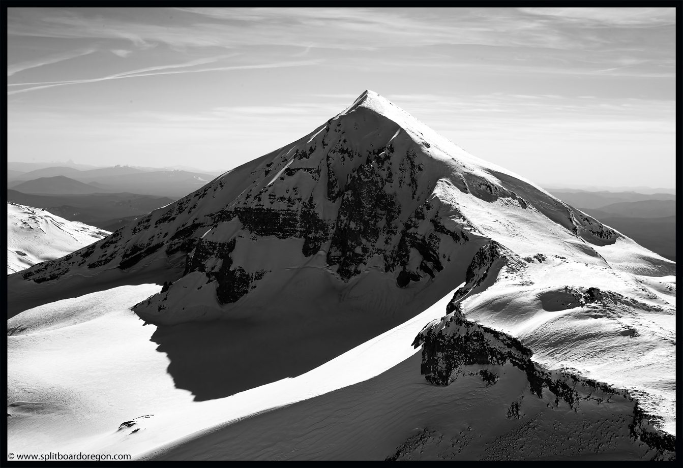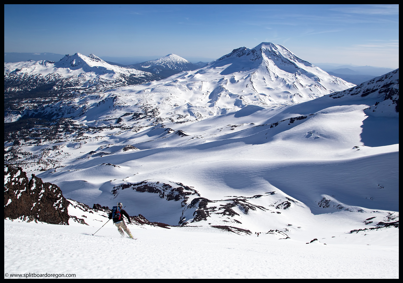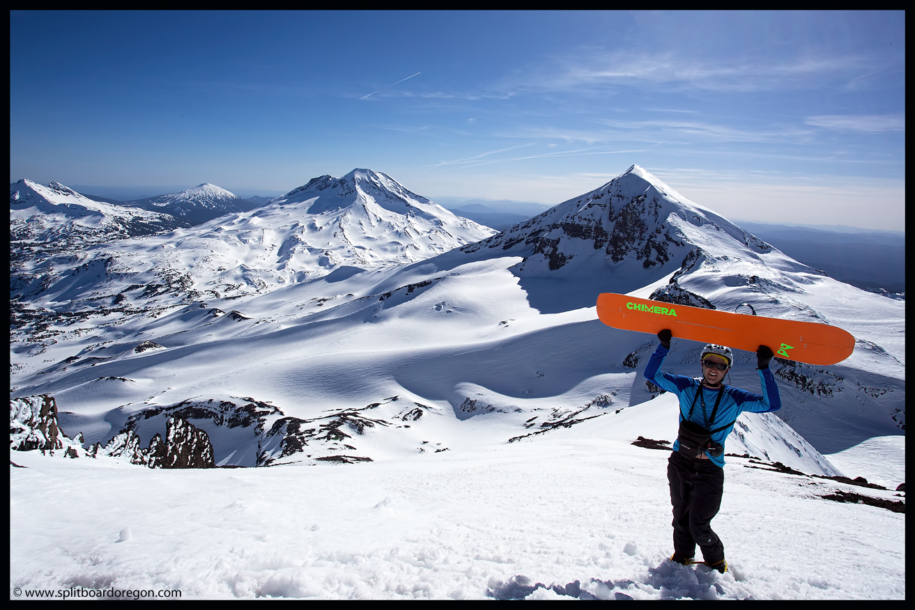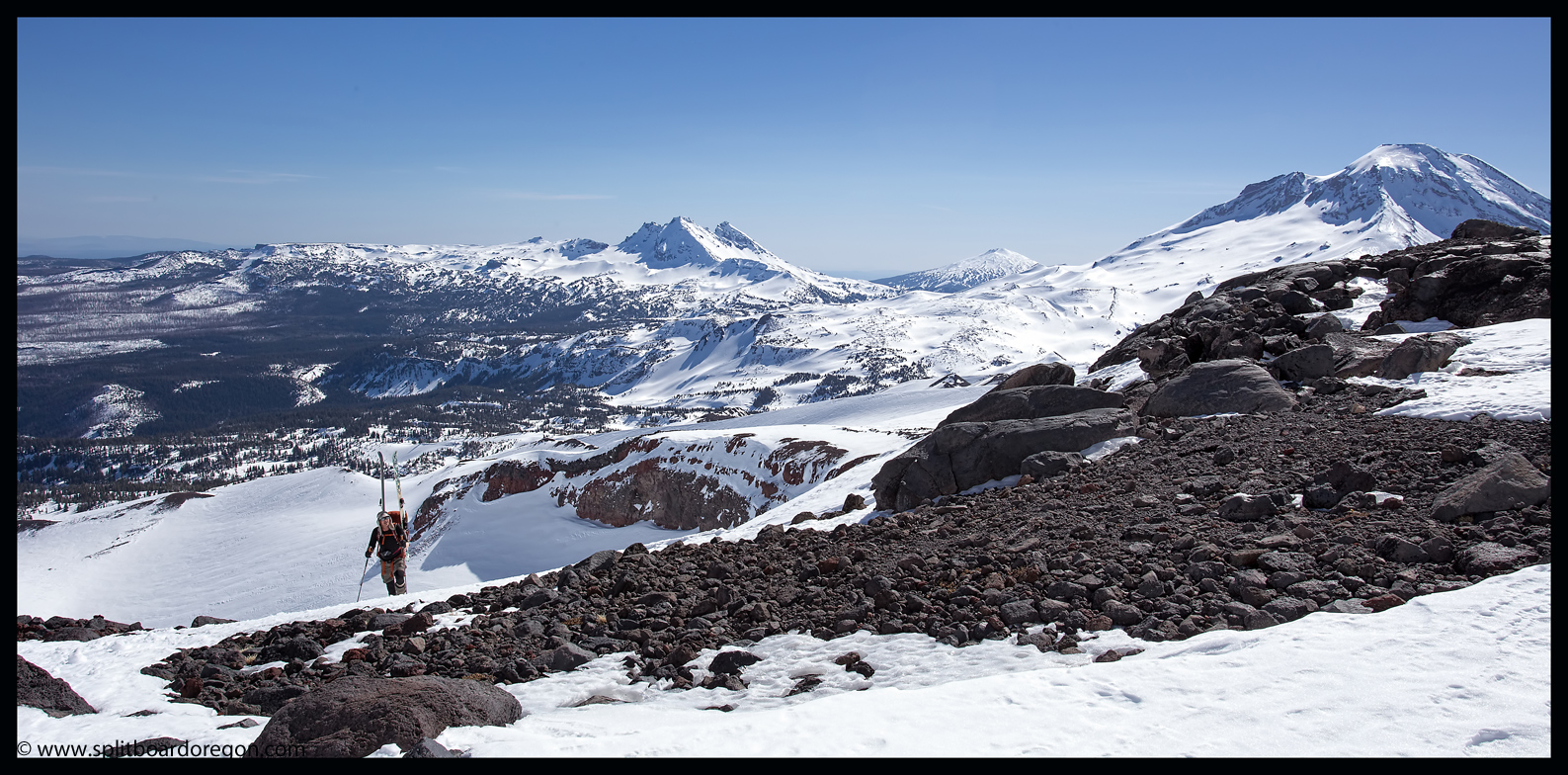 Rather than skin up the Hayden Glacier as I’ve done on previous trips, we elected to stay north of the Hayden and climb along the base of the southeast bowls of the North Sister. As we gained more elevation, the views became increasingly better. Below are a couple of shots of the crew skinning up as well as looking out across the flats towards South Sister….