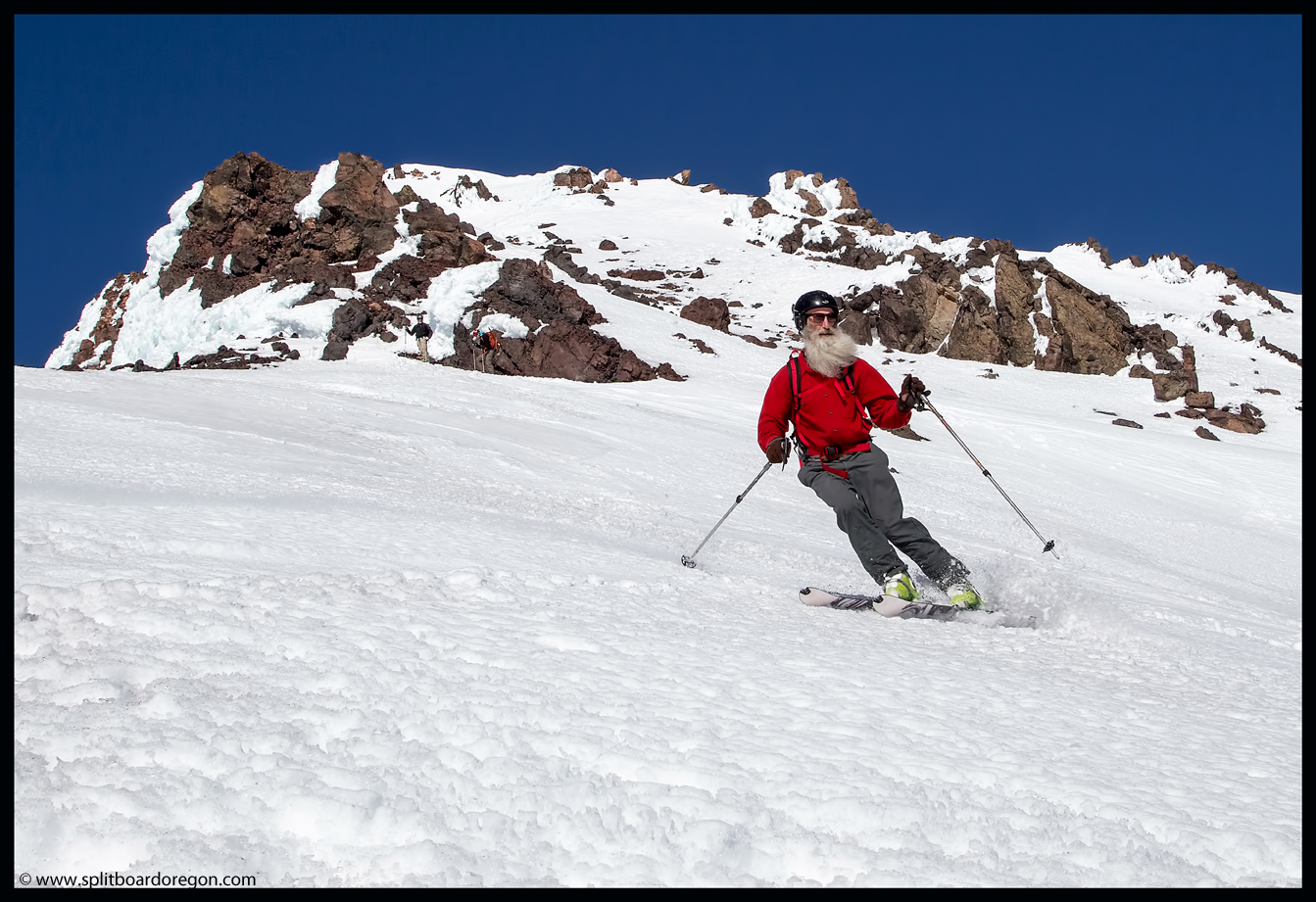 Once we made it out onto the Hayden Glacier proper, the snow turned from corn to chalk, and it skied well. Riding down the Hayden is one of my favorite experiences in Oregon, as the turns go on and on and on. Numerous fun features, including small wind lips, rollovers and natural drops allow for much expressive creativity on the ride down. Below are a few photos I snapped of Dan on the way down….