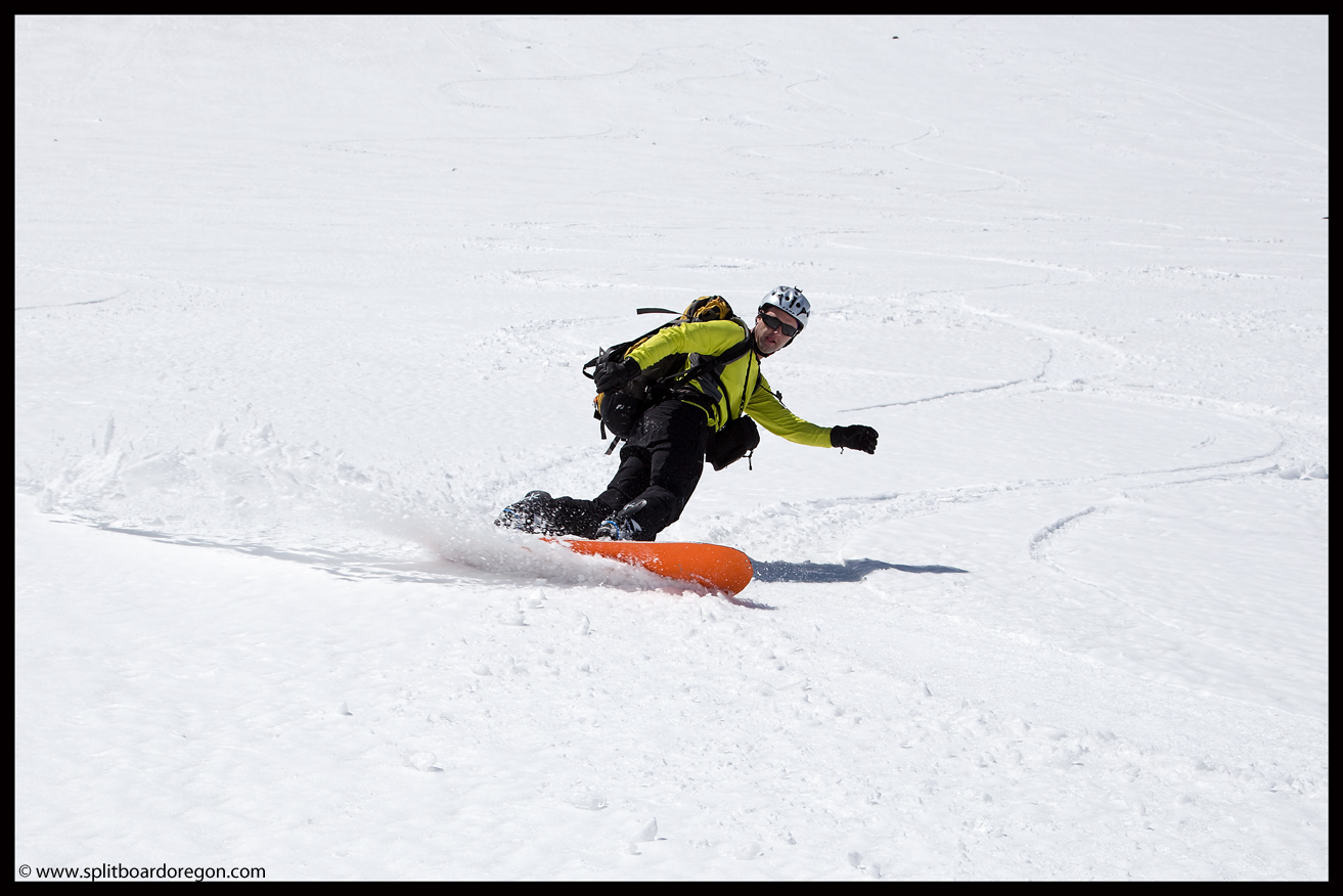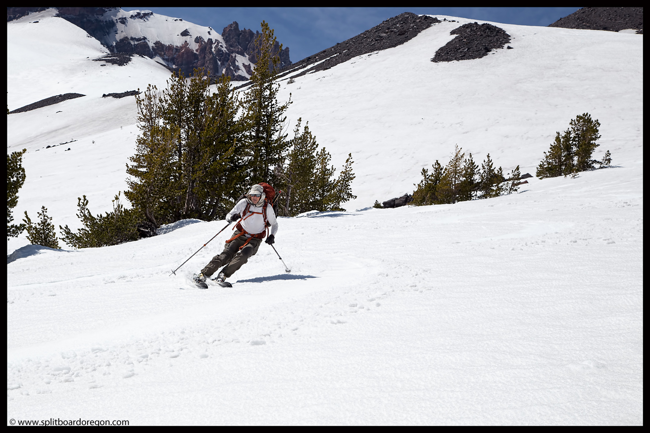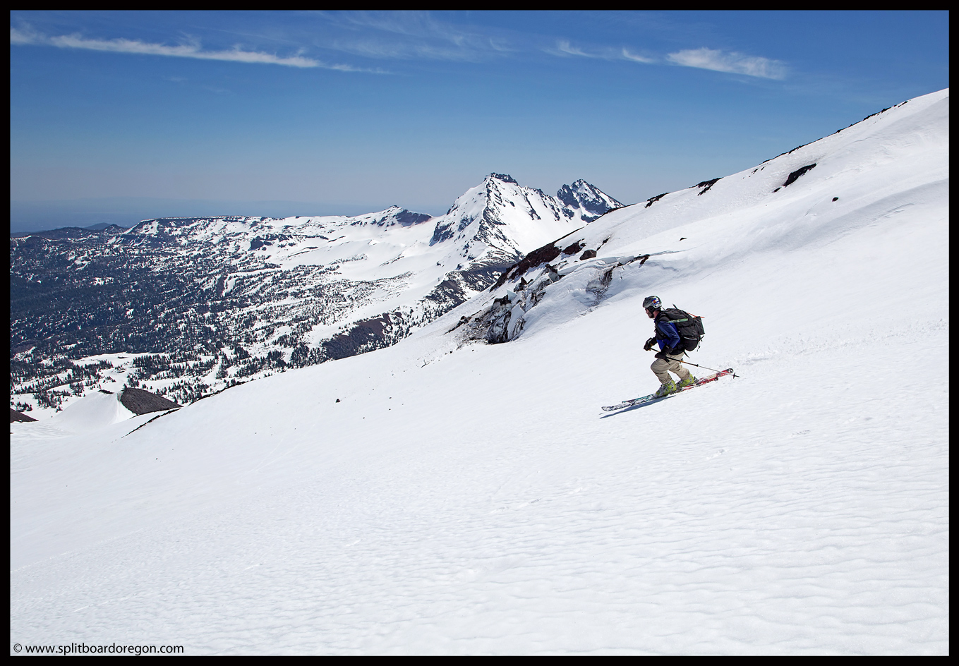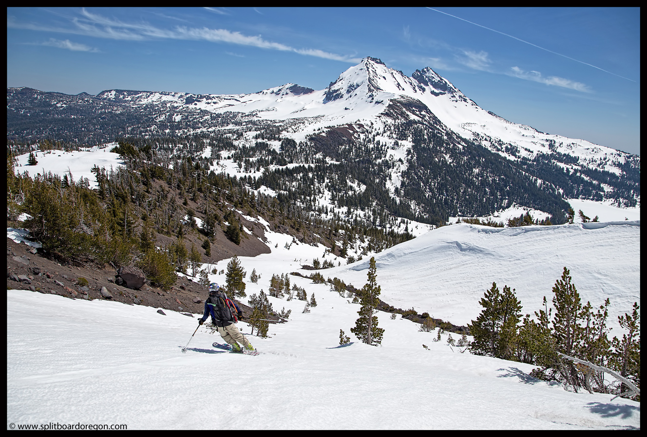 Working our way back to the east facing slopes above Green Lake, we continued to make turns and the snow remained in good shape. Below are a couple shots of Joe with Broken Top on the descent…..