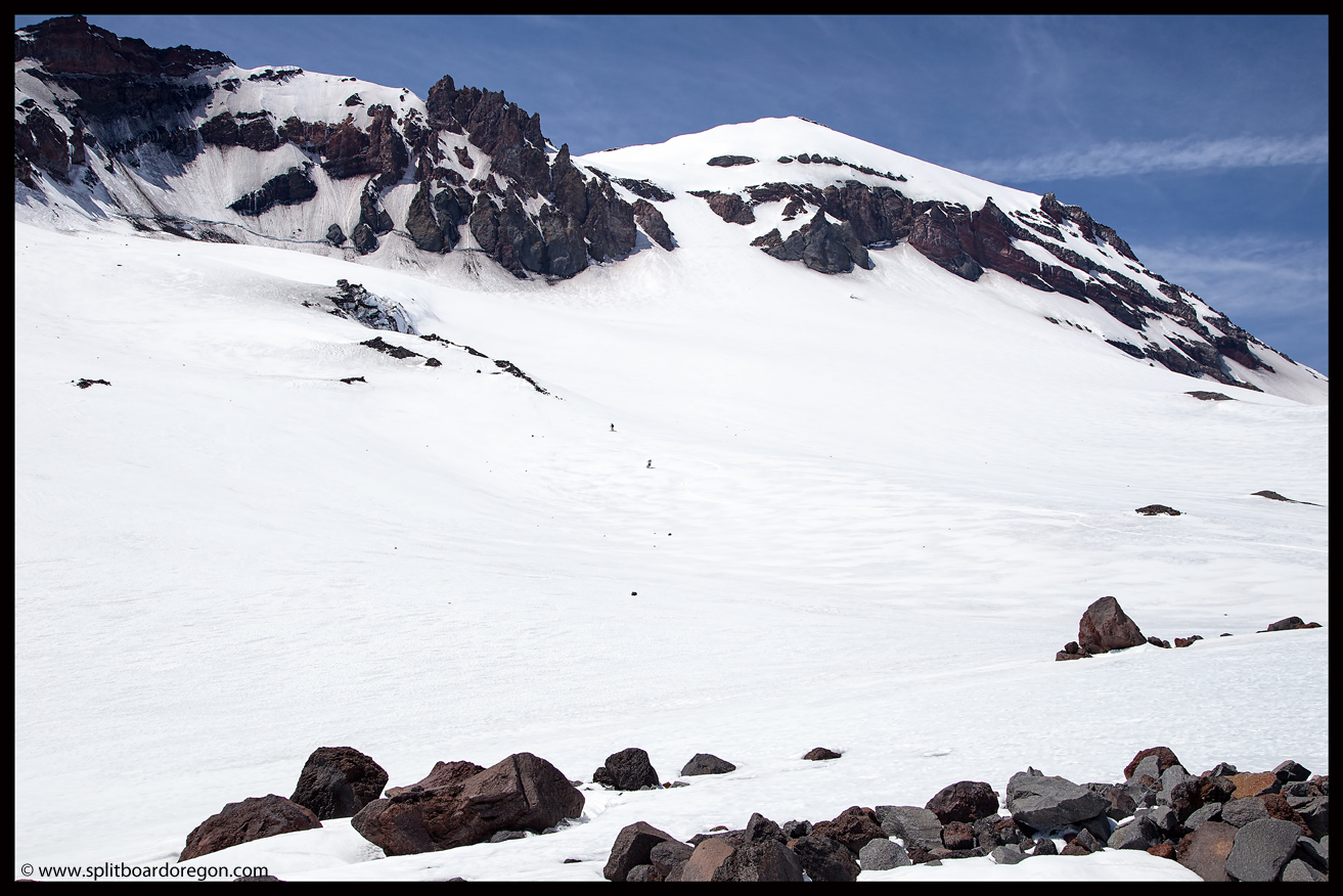 We cruised back down to around 8,o00 feet, looking for the location near the lower moraine pile where we followed a continuous snow chute up earlier in the morning. I rode down first, and when I turned around captured the below photo of the two skiers coming down, looking like ants….