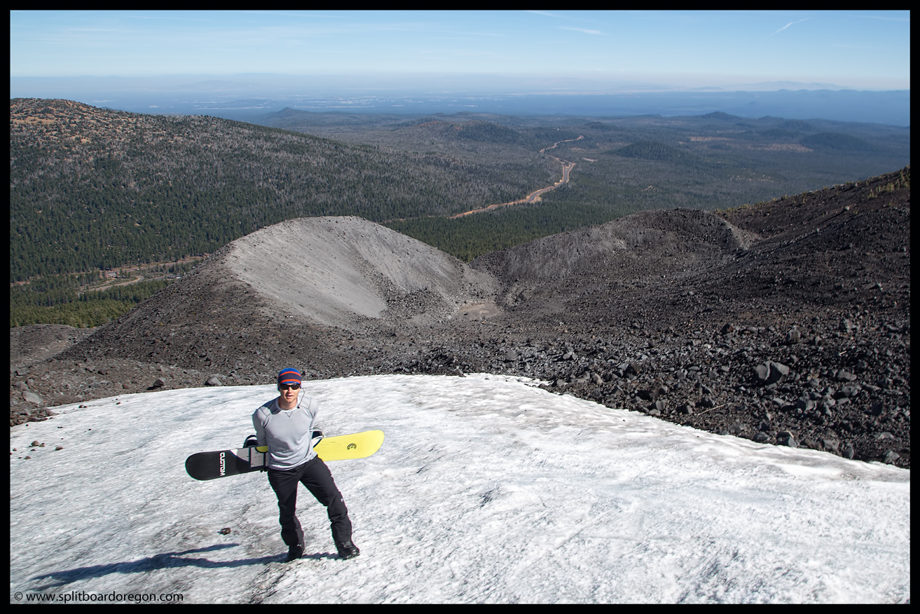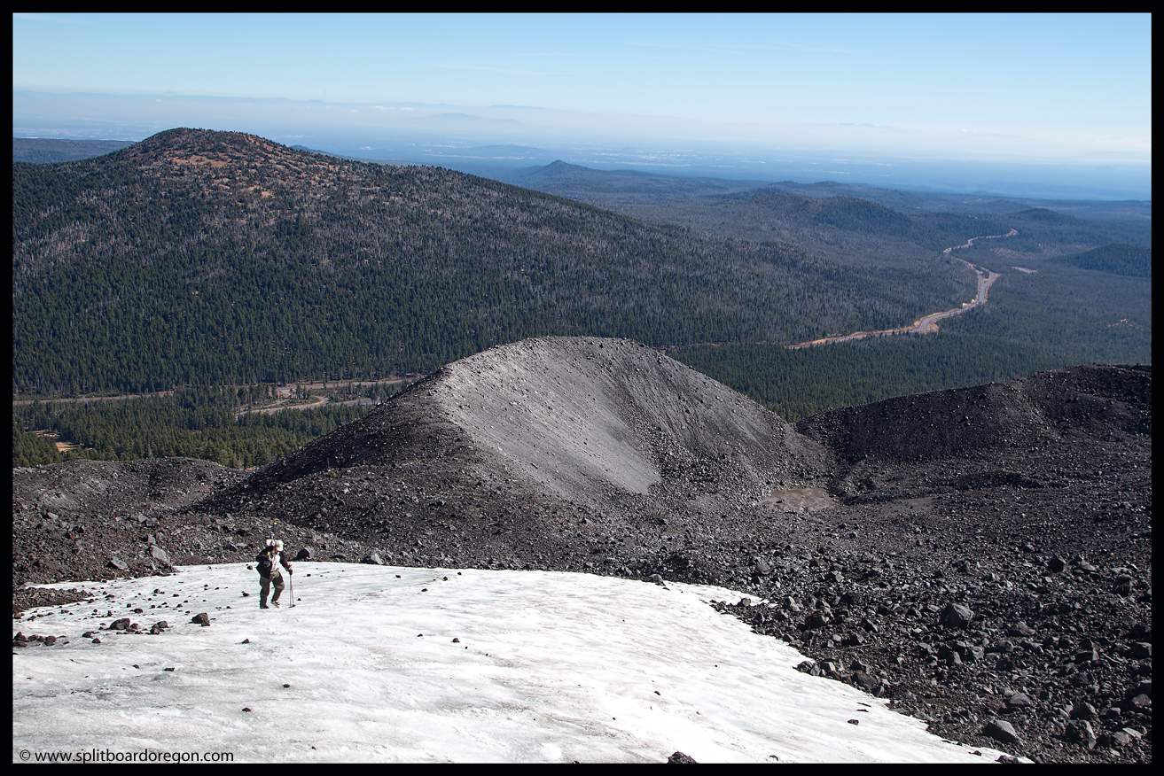 “I’m pretty sure we’ll find snow, but who knows” Dan said, referring to our plan to head to Mt Bachelor and see if we could find enough snow to eek out October turns. After the poorest winter on record, we both had our doubts, but remained optimistic as we headed up Highway 58 on Sunday morning. We made a pit stop at the trailhead to Nash Lake on the Cascade Lakes Highway, and it was windy – a sign for what we could expect later in the morning. We pulled into the Bachelor parking lot around 9:00 am, and were hiking shortly thereafter, enjoying the views north and west towards Broken Top and South Sister…