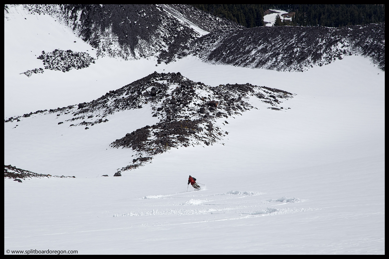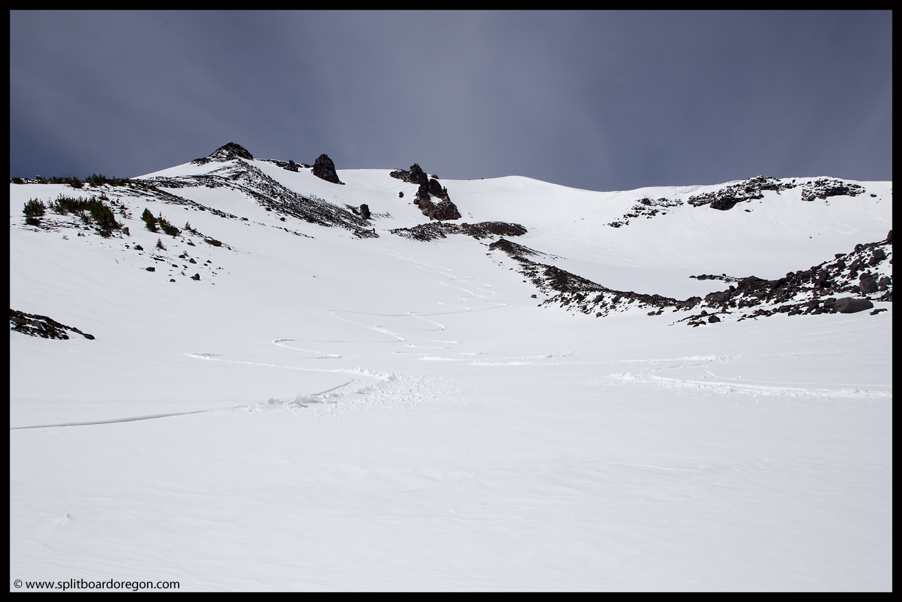 After about an hour and a half of skinning, we reached the summit, and prepared to drop into the Cirque bowl. To our surprise, the few folks who were ahead of us skied back down under the lift, which meant first tracks for us….