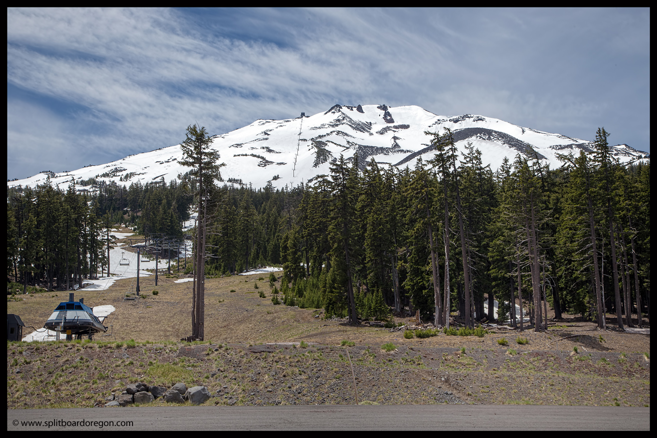 We quickly drove up to the Sunrise gate and loaded our gear and headed out. Only a couple of folks were ahead of us as we started up, and there was a couple inches of fresh around mid-mountain. By the time we were skinning under the Summit chair, the snow had increased to around 4-5 inches. I stopped briefly to capture Broken Top with a fresh coat of white…