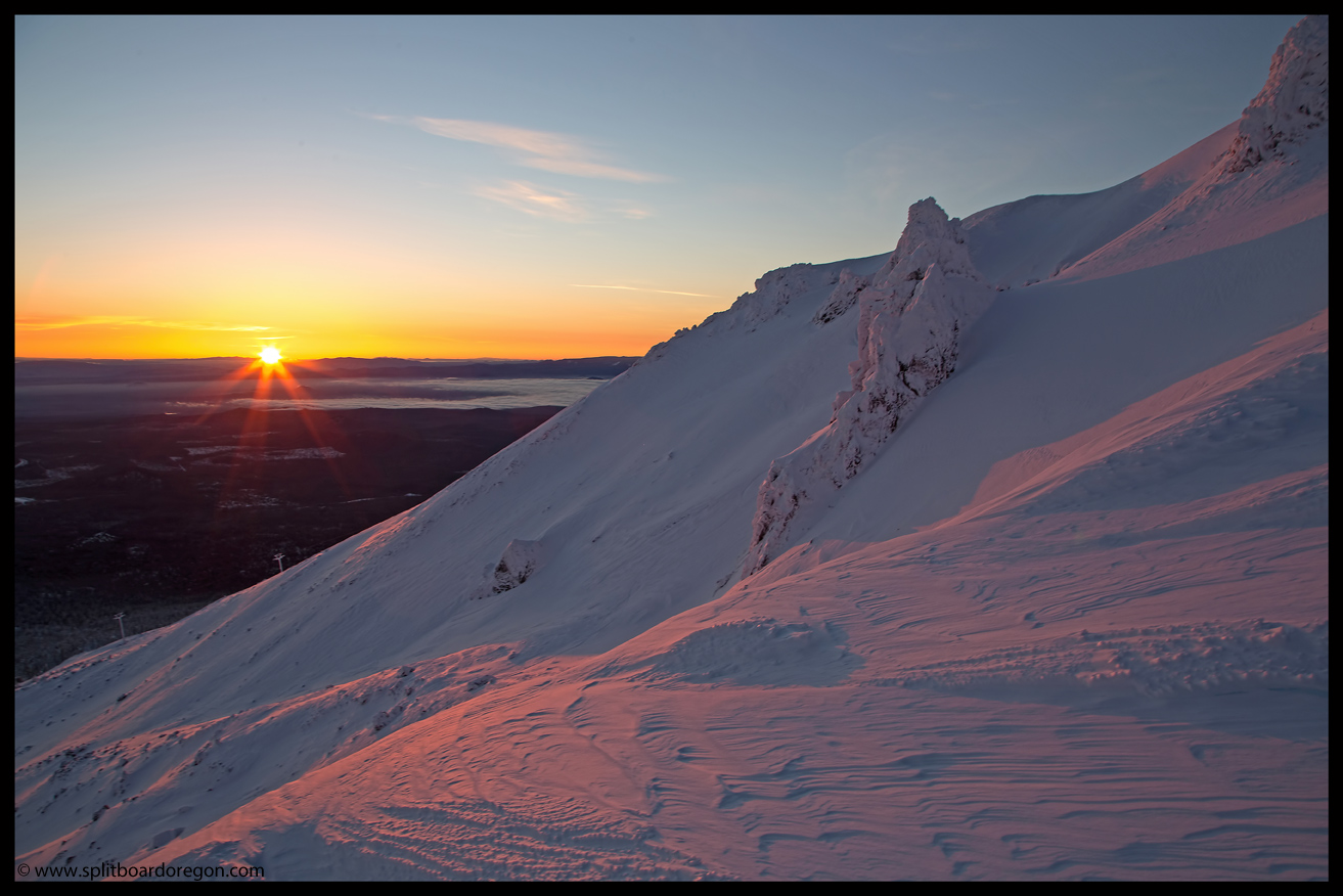 I prepared to drop in, and switched over to ride mode on the split. Looking off to the west, I could see the early morning shadow of the mountain from the early morning light, as well as the snow caked Three Sisters and Broken Top glistening in the early morning sunshine.