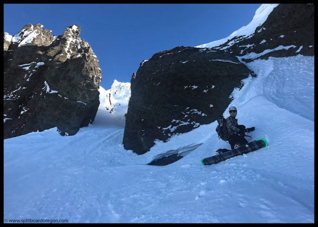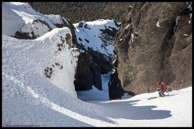 As we worked our way down into the couly, the slope steepened and the snow became hard. The soft snow we were hoping for in the deep shade of the line didn’t materialize, but we were already committed so we had to put our alpine riding skills to the test. It was a mix of jump turns, a bit of side slipping, and a few good turns, as we entered the heart of the line…