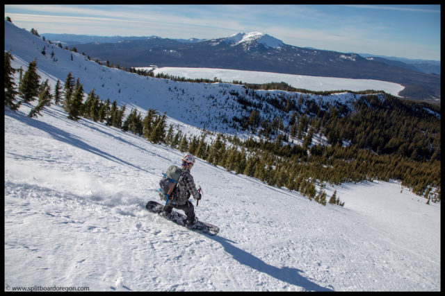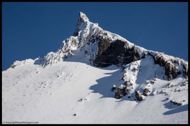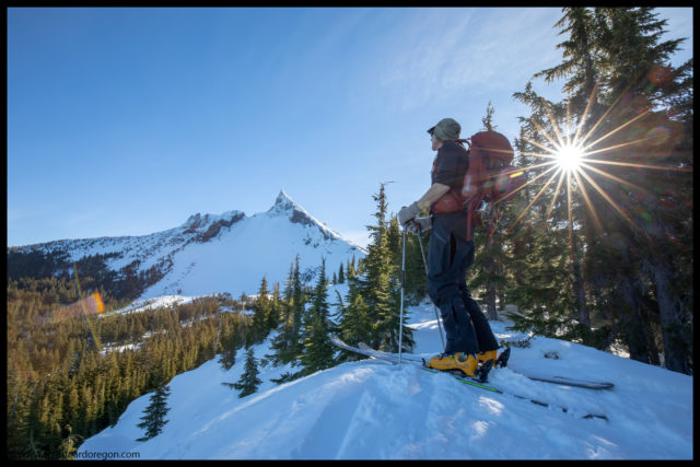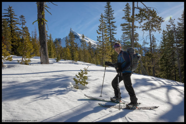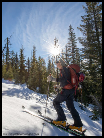 It looked like high pressure would hold on for another day or two, and the stars aligned such that both Dan and I were able to get a day off work mid-week to try and harvest some mid-winter corn. Mt Thielsen was our selected destination, and we met at Dan’s house at 5:00 am for an early start. We made quick time to the trailhead, as the roads were dry and bare, and our drive was reminiscent of summer. We pulled into the trailhead at 7:30 am, quickly sorted gear, and started skinning on crunchy snow. The temperature was in the low 20’s, but we knew it wouldn’t stay that way for too long.