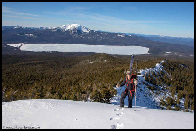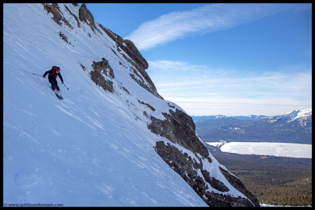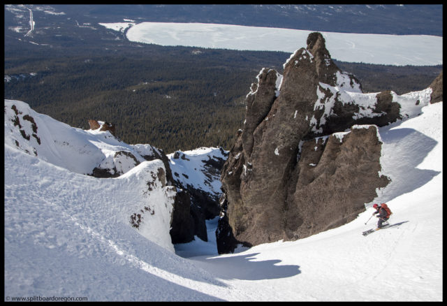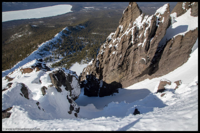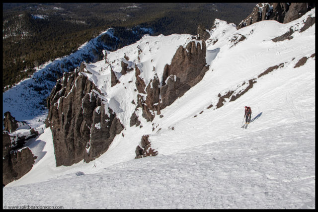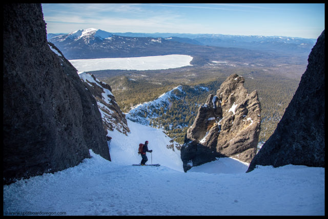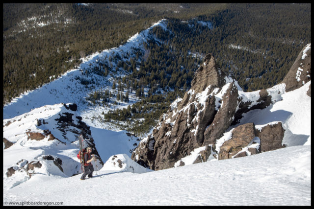 We continued up the ridge, pausing periodically to enjoy the views back across the frozen Diamond Lake and out over Mt Bailey. The temperature was starting to warm considerably as we worked up the ridge and out onto the south facing slope. Traveling up the ridge, I had my eye on the northwest couloir. It looked like it would go. Dan was skeptical, but after a little discussion, we agreed and started to get stoked on the line…