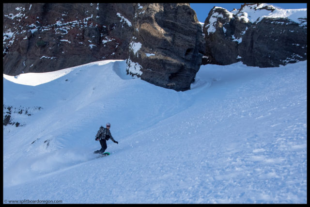 To our right and to our left, the snow wasn’t prime, but right down the gut it was holding in a swath that was about 30 yards wide and 600 feet long. We hooped and hollered all the way down…
