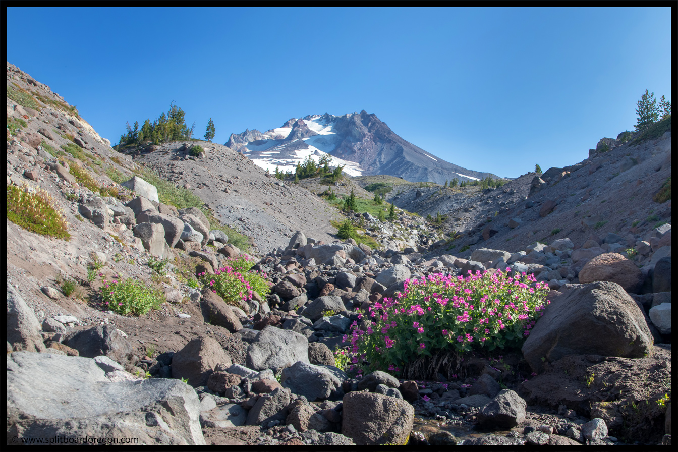 We organized gear, loaded packs, and set out up the trail from the climbers lot. The climbers lot was as packed as I’d ever seen it, and it was nice to get away from all the commotion. I snapped a picture of Mt Jefferson to the south before we headed out, and then a pic of Hood with some wildflowers shortly up the trail…