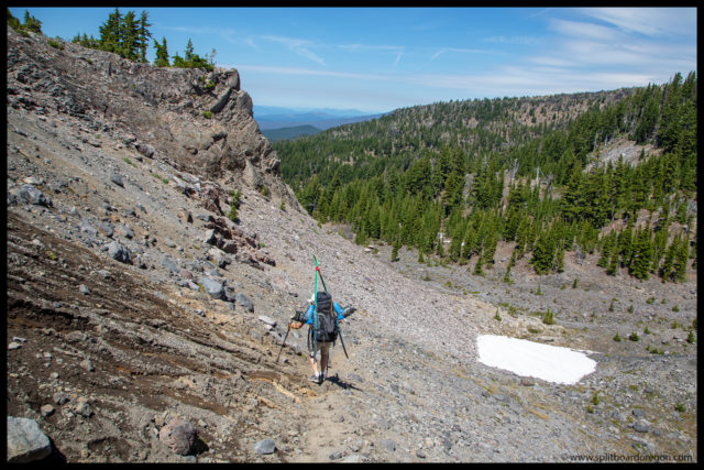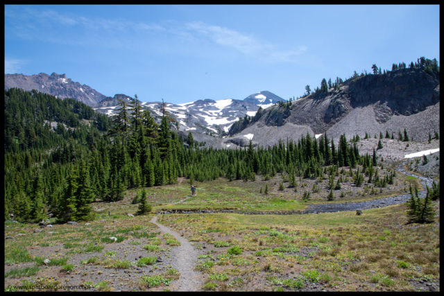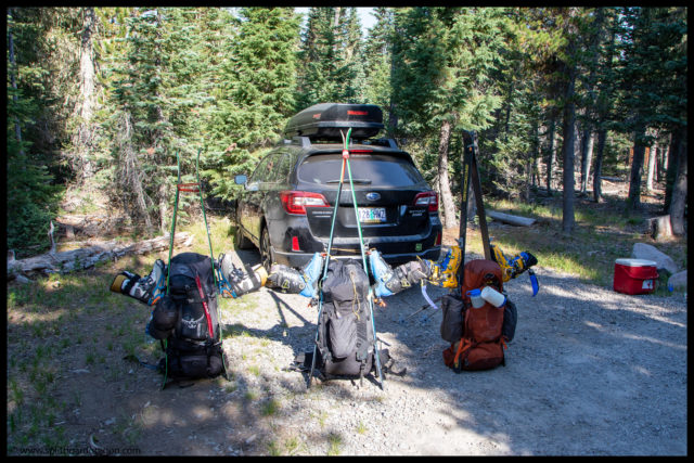 It had been three years to the day since Joe, Dan and I had been into Middle Sister for and end of July/start of August ski, and we were feeling pretty fortunate to be holding a permit this season. As an added bonus, it looked like the weather window was going to work out perfectly for our ski — not too hot, and no rain in the forecast. We met at Dan’s house around 6:30 in the morning, loaded gear into my Subaru, and headed up Highway 126. We arrived to a somewhat deserted trailhead, found a great parking spot, and started loading skis onto packs.