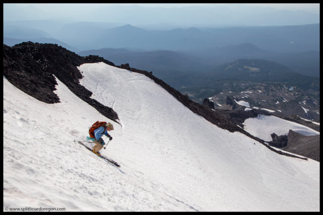 We headed up the trail, and switched over to ski boots at the start of the snow. The hike up the snowfields was refreshing with light packs (after ditching all the heavy gear back at camp), and we made it to the top around 5:00pm. As usual, the view from the top of what we call the Interglacier (between the Renfrew and Collier glaciers) out over the McKenzie Valley was stunning. After a few minutes enjoying the view and changing over to ski mode, it was time to drop in for our first run of the trip….