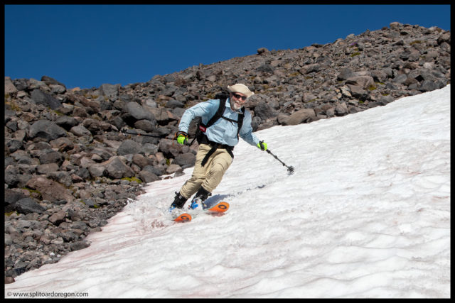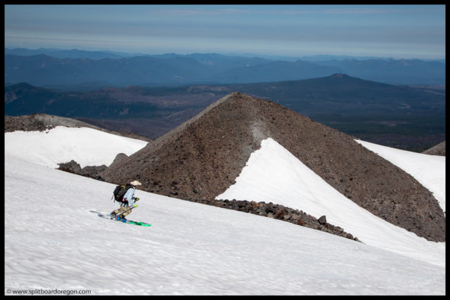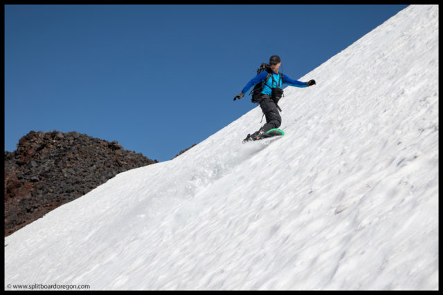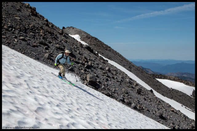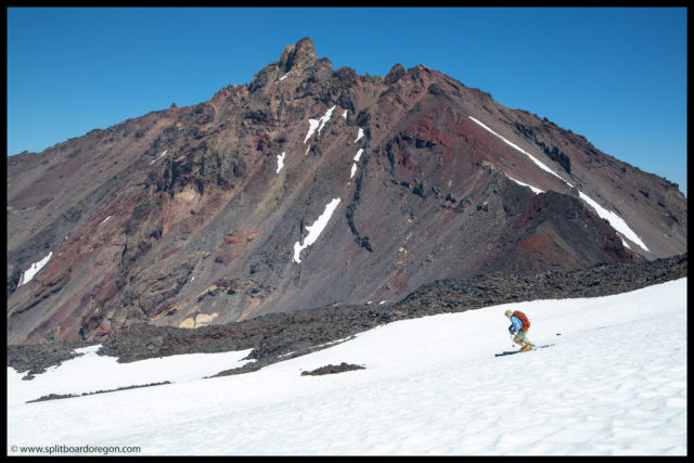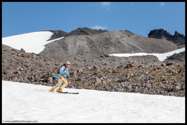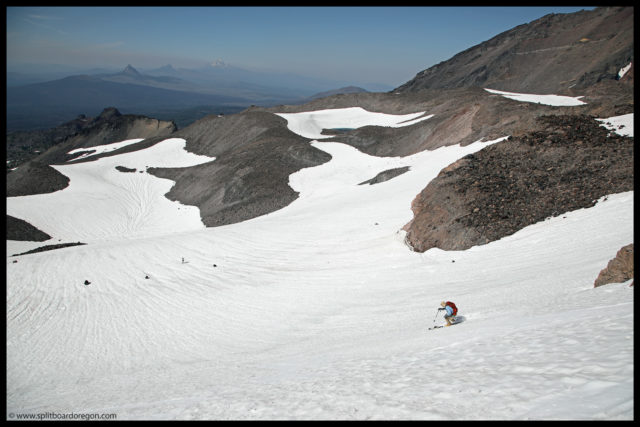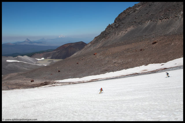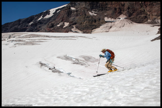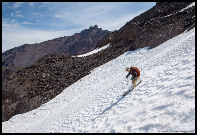The hike over the rocks was short, and within a couple of minutes we plopped skis down and were enjoying turns on the upper low-angle snowfields on the Collier. The snow was in really nice shape, so we continued down, staying to skiers left to avoid any crevasses we couldn’t see below us…