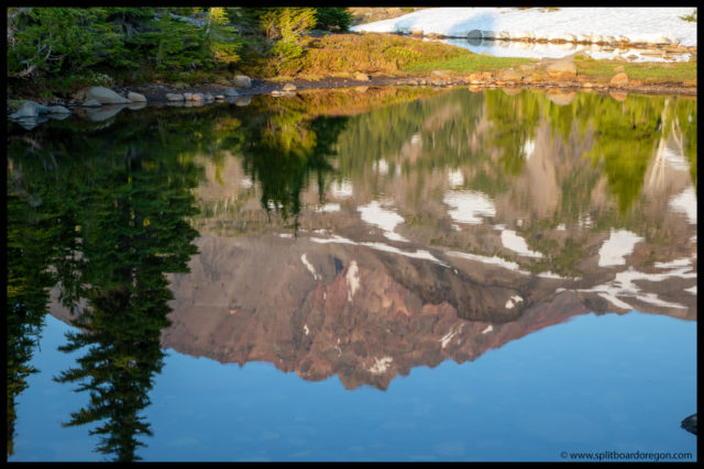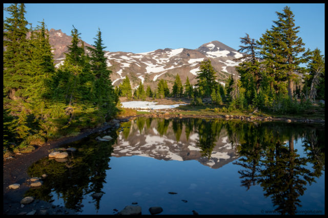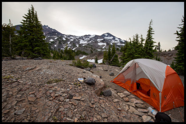 With a margarita in hand, it was time to take my boots off, kick back and relax. There was only one problem — or rather several hundred problems — a few minutes after getting back to camp, hordes of mosquitoes were feasting on any piece of exposed skin I had. In the previous two trips to Middle Sister, there had only been a few mosquitoes here and there, but this evening they were out in full force. Head nets and gloves were mandatory, and it looked like an early bedtime would be too to find any relief. I did manage to walk around the lake and snap a few shots from the rim before hitting the sack however.