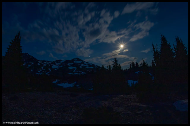 Eventually the bugs proved to be too much, and we retreated to camp and into our tents. I had planned to take a few shots of Middle Sister under the stars later that night, and left my camera and tripod setup outside the tent before hitting the sack. A couple hours after retiring to the tent, I woke to see what conditions looked like. Some clouds had moved in and the moon was super bright, but I decided to try a few shots anyway to see how they might come out, and was pleased with the results.