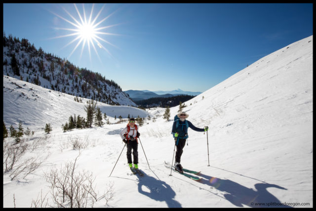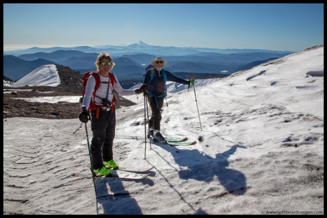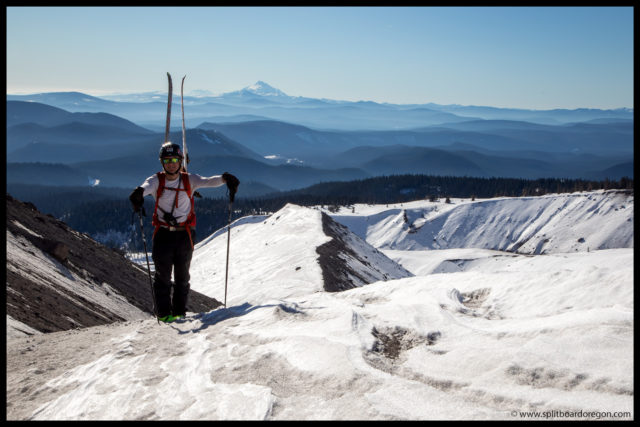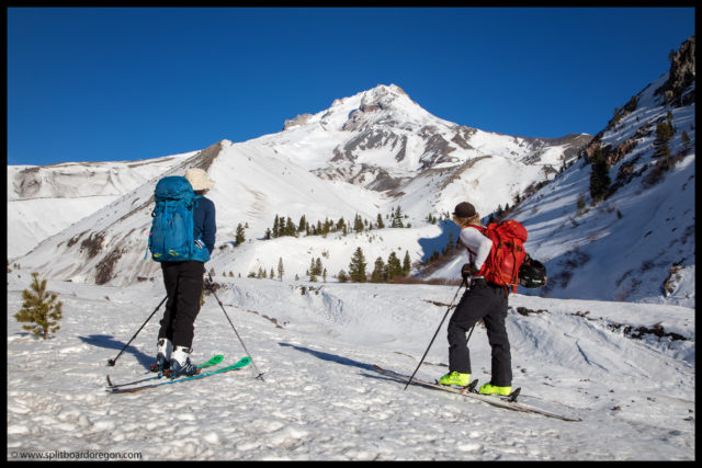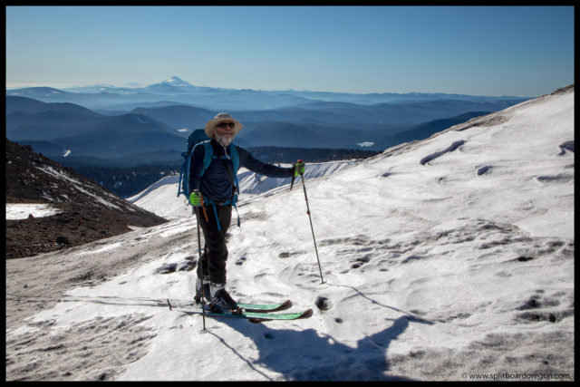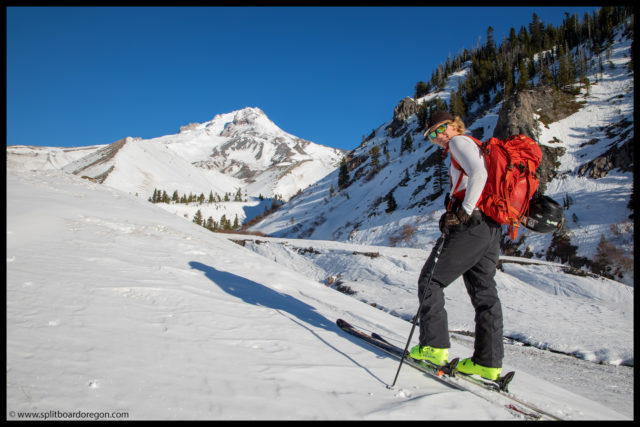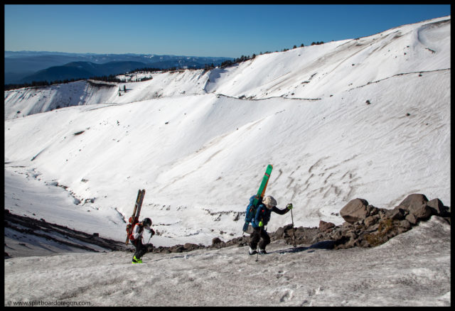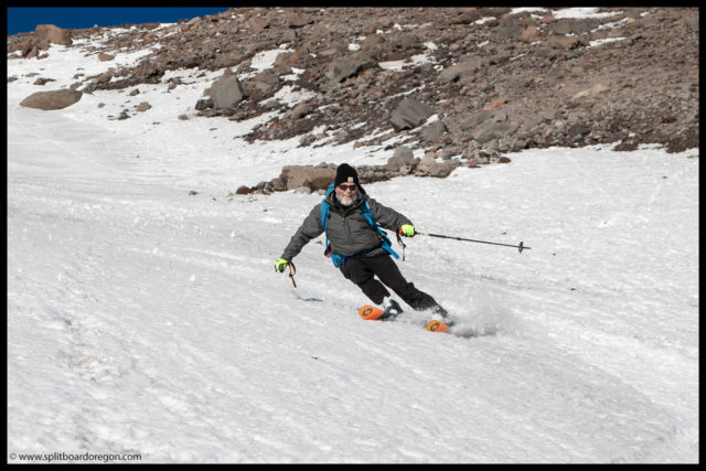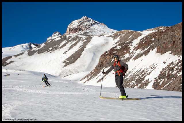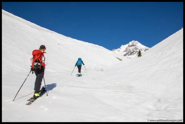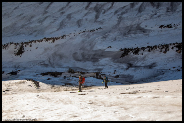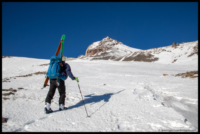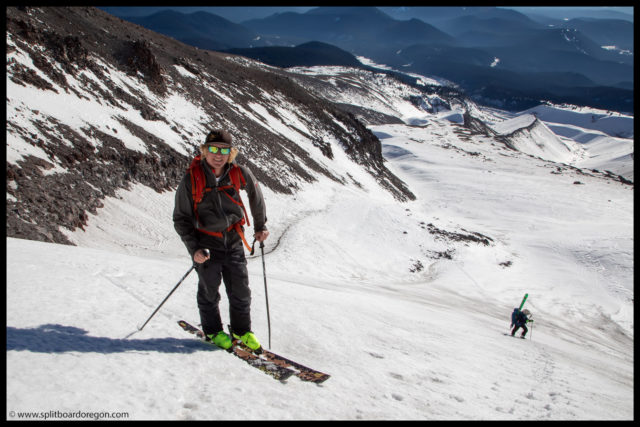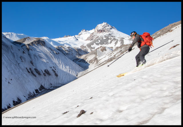 Once we navigated through the steeper section, it was back to skinning. As we ascended, the weather was staying really nice, and it became clear that our objective was what I call the “finger.” The finger has a south aspect, which was what we were looking for in hopes of scoring some corn, and also is a feature that I’ve been looking at on Hood for over 20 years but for one reason or another hadn’t yet skied.