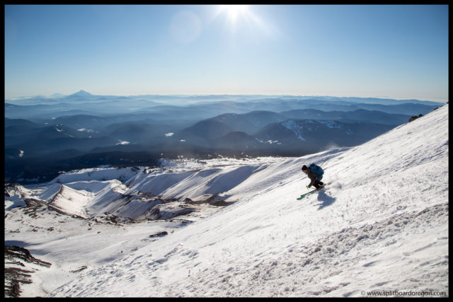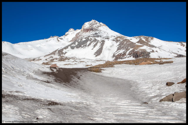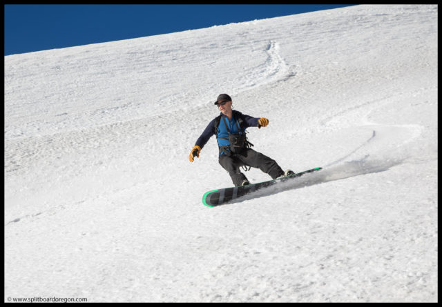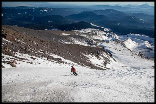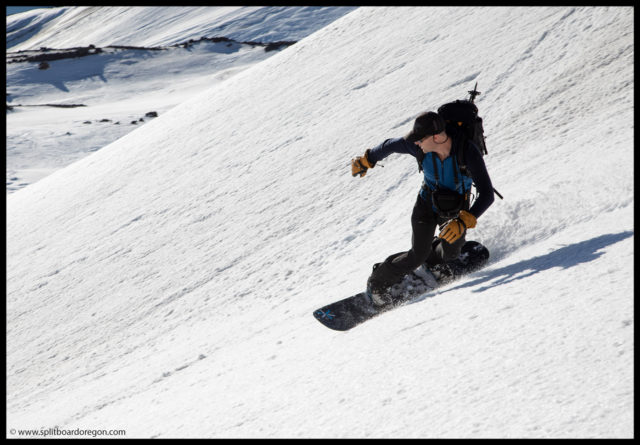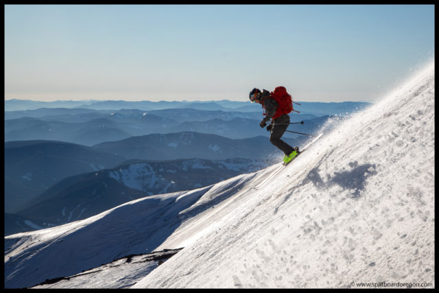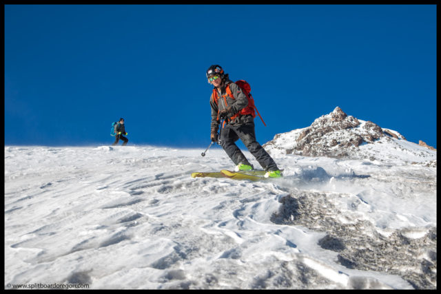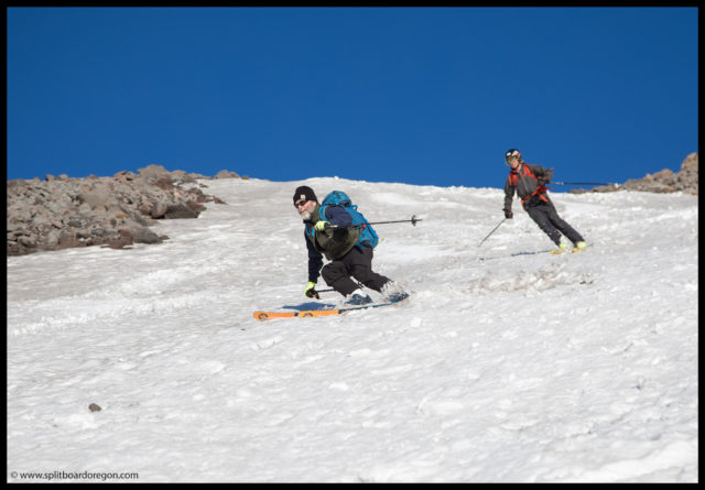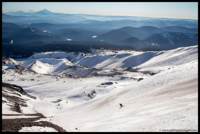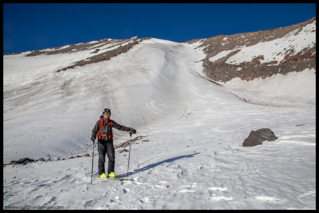 About an hour after we started booting, more or less, we topped out on the finger, and decided to head on up for another few hundred vertical. The snow here was lower angle, and a mix of wind buff and firm crust. Continuing on, we made it to about 9000 feet before calling it. From this point, it looked like it would be an easy traverse over to the Wy’East face, but given the hour, the conditions and our tired legs, we decided to call it.