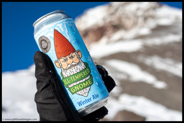 We transitioned to ski mode, and took a few minutes to enjoy the view. It was quite windy at 9000 feet, but otherwise sunny and beautiful. I brought out my beverage of choice for the day, a tasty winter Ill-Tempered Gnome from Oakshire Brewing, and snapped a few photos. After that, I put it back in my pack to drink at the bottom of the finger, and we stepped into our bindings and started off.