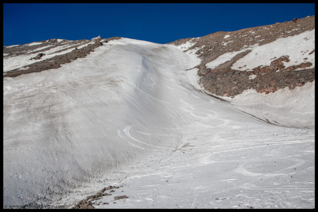 The finger is much bigger and longer than it looks from below, and I headed down another several hundred feet and snapped some more pics of the skiers as they headed down. Everyone was thoroughly enjoying the turns, and really ripping the slope…