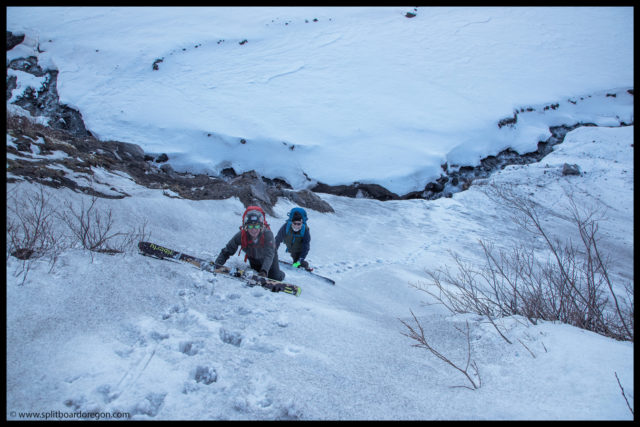 We worked our way up the canyon, to a point where we needed put the skis on the back for a short carry across a melted out steep pitch. It looked like it probably went a week or so back, but at this point in time there was a gap between the snow of about a hundred feet. Adding to the challenge, there was quite a bit of rockfall coming down the slope. It looked like we could climb downward at a 45 degree angle, and cross at a narrow spot to minimize the risk. Our plan worked perfectly, and soon we were headed back up the hill…