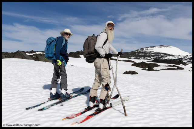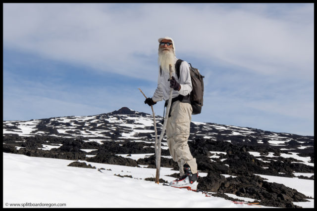 With that, we headed out, and quickly gained access to the lava fields and views they afford just a little bit beyond the road. It looked like for the most part that the snow fields were connected, and there might only be one or two spots where the skis would have to come off. Meanwhile, Joe and I had to give John shit on the skin track for forgetting his poles. He earned the name “stickboy” and the joke that was told a few times was “Give a man a stick, he skis for a day. Teach a man to find his own sticks, and he skis for life.” I do have to say though, with the sticks, he looks even more like John Muir.