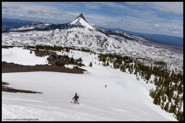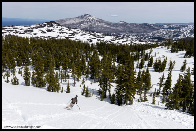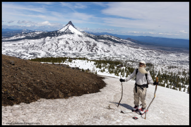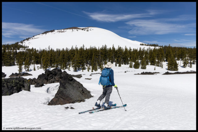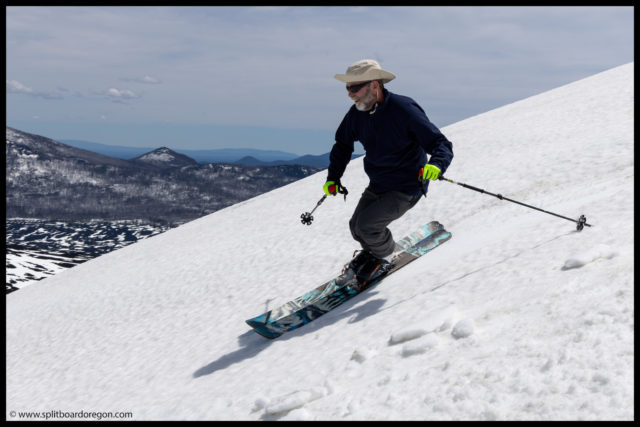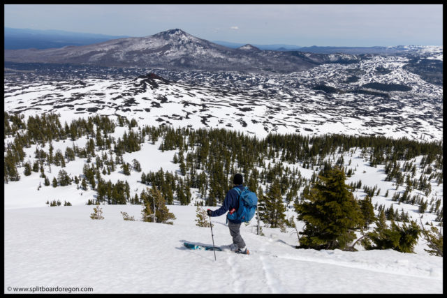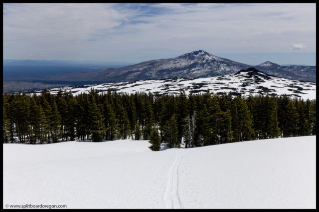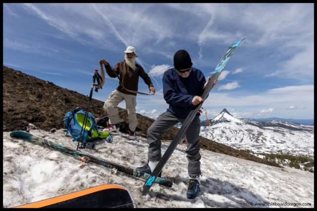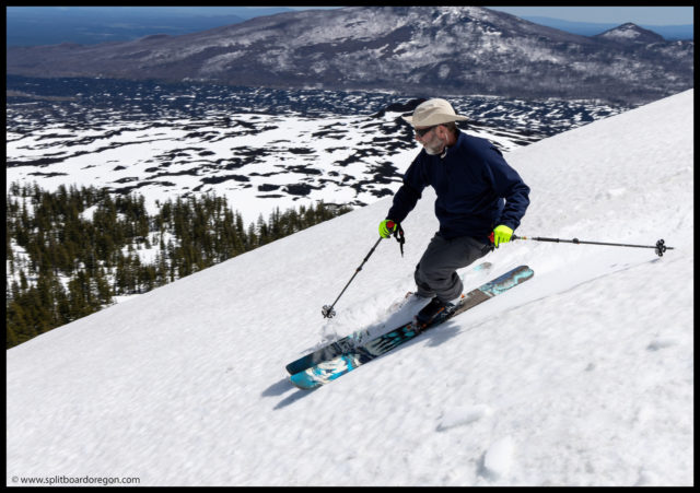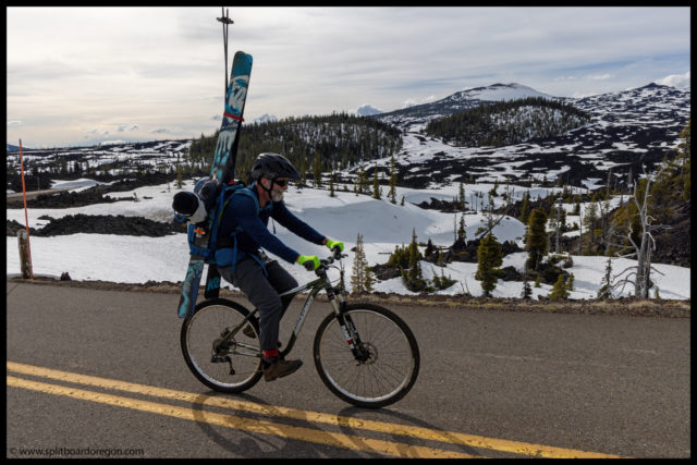 The “ski” out from the bottom of Belknap proved to be pretty challenging. For some reason, the snow had a ton of pollen in it, and we picked up a ton of pollen/tar on our bases, making gliding out very challenging. I switched to split ski mode, and we slowly worked our way out to the trailhead. It took nearly as long to get out as it did to get int, but finally we made it back to the bikes, and found Dennis there waiting. Turns out he did get out for a tour, and was able to see us up top of Belknap from the lava fields below. At the bikes, since we weren’t camping, Joe and I hit the road rather quickly, and bid John and Dennis farewell.