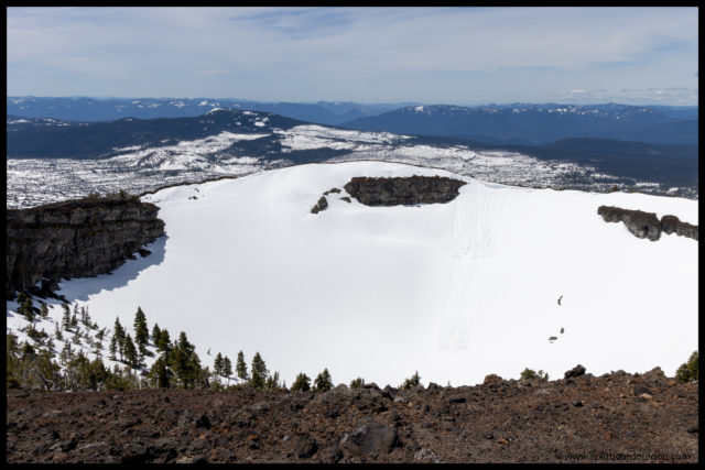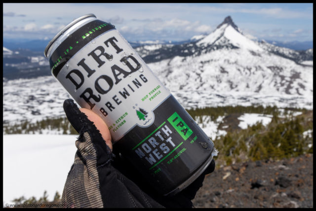 After enjoying the views to the south and out across the crater, we headed down towards the ski gear and found a wind break where we could sit and enjoy the views as well as drink a cold beverage. It sure felt good to bask in the sun while being protected from the wind, and it also felt good to tip back a cold beer. My beer of choice for the day was a tasty Northwest IPA from Dirt Road Brewing, brewed in the town I grew up in – Philomath, Oregon.