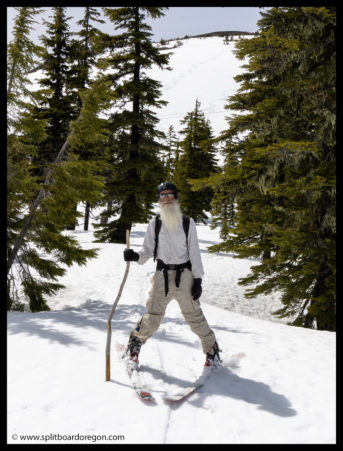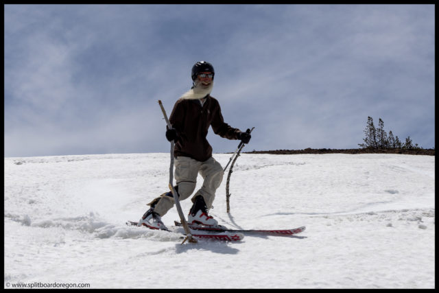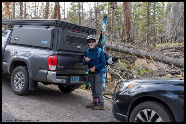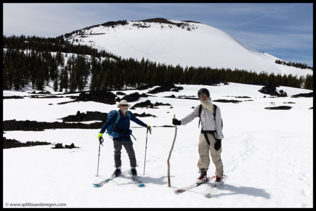 At the trailhead, we met up with John and Dennis. Dennis was having an issue with one of his skins (it had failed the day before on the South Sister), and John realized he forgot to load both of their poles on the bike trailer. John was fretting a bit and even though about biking back to the car, but we figured it would kill too much time and give us way to late of a start. Not to worry too much, I found a couple of suitable sticks from a tree near the road that would work. Dennis decided his skin issues were likely going to be too difficult to work out right away, so he told us to head out and that he’d meet us at the trailhead in the afternoon and may just go out for a tour across the lava fields if he could get the skins working again.