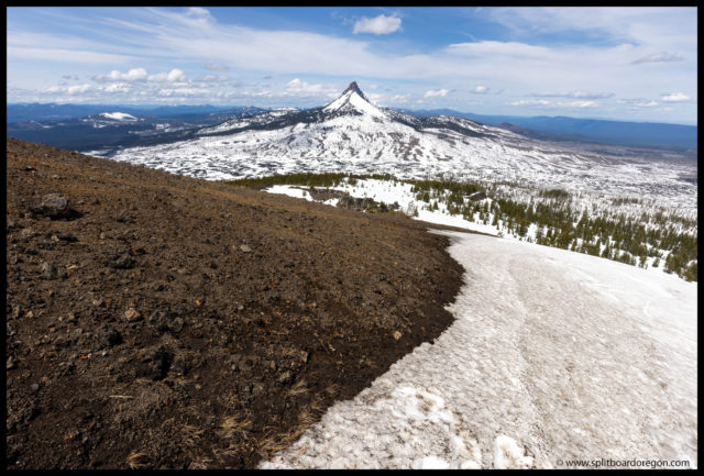 Back at the top, I enjoyed what was left of my beer, and we waxed up our bases for a bit better glide on the way back down. After talking it over, we decided to head over to the south side of the crater and give the south side of the east face a go. We figured the east face may slide with the snow being so soft, but figured we could work our way towards the south ridge if need be and ride next snow/dirt line.