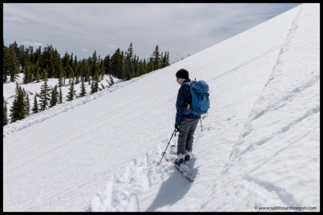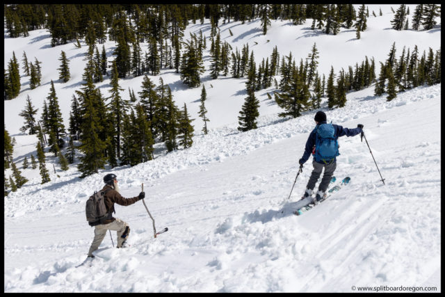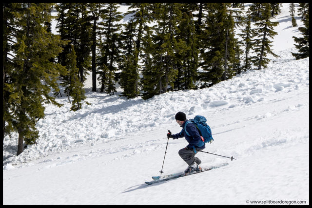 We worked our way down the ridge and then wrapped on down around towards our skin track below. The snow was pretty good all the way down the ridge, but became a bit sticky lower down. Once down to the trees, we switched back over to skins and headed back up for another lap.