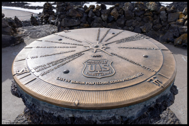 We pedaled our way back up to Dee Wright, and opted to stop and check it out for a few minutes before heading on down the road. The views from the observatory were pretty nice, and the cutout notches for all the surrounding volcanic peaks were pretty cool too. They even had one for Belknap Crater.