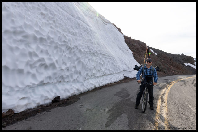The months of April and May were super snowy this year in the Pacific Northwest, and for that I’ve been really thankful. That said, I jumped at the opportunity to head out with John and Joe to get some corn snow turns in on a peak I’ve always wanted to explore — Belknap Crater. Given some challenging logistics, I met up with Joe, John and John’s friend Dennis at the snow gate on 242 around 6:30 am. It didn’t take long to load our packs, hop on the bikes, and head out.