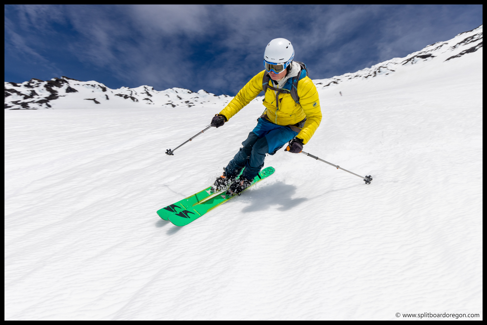 I shot a bunch of photos of the skiers as we descended, and in between taking some shots of the action I enjoyed several big, sweeping turns down the steep pitch, with a few occasional jump turns mixed in. One of the things I love about this line on Adams is the views looking off to the north as well as looking down the line on the from above with the forest sprawling out below.