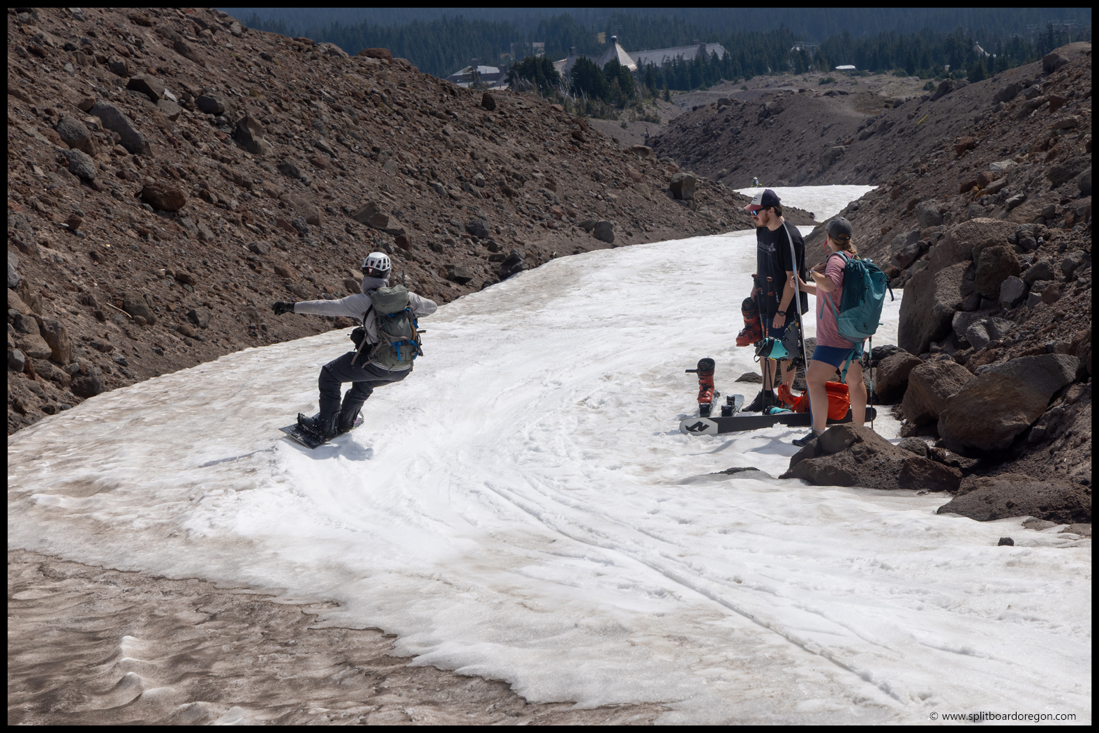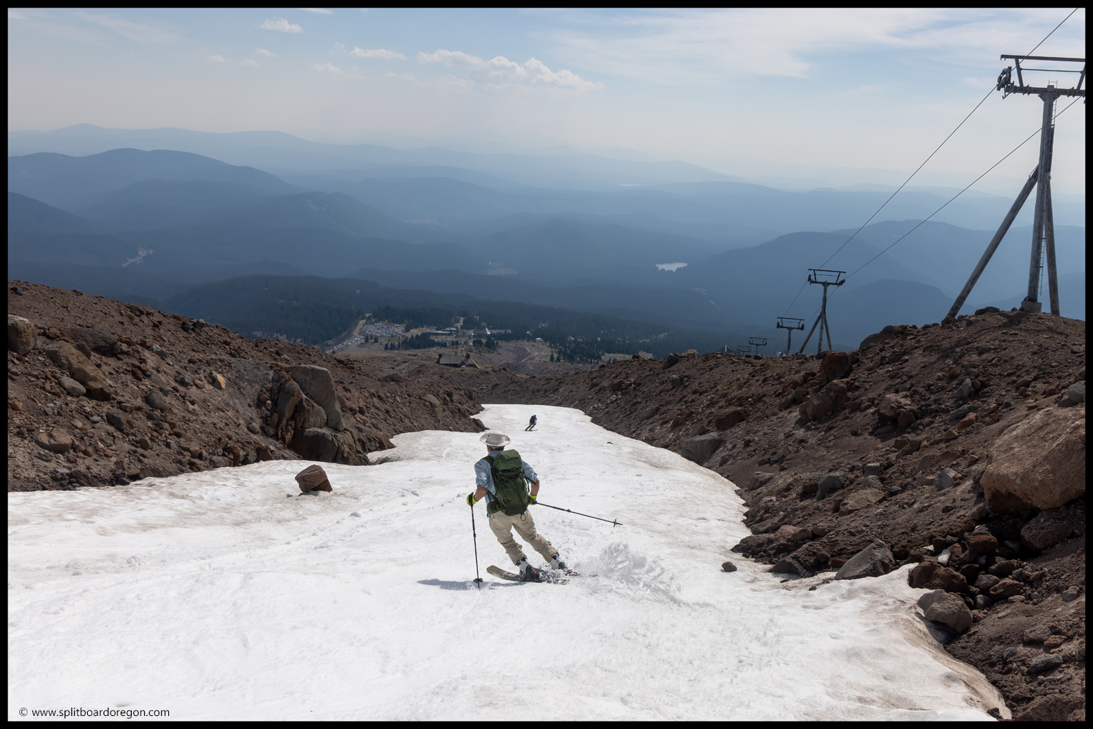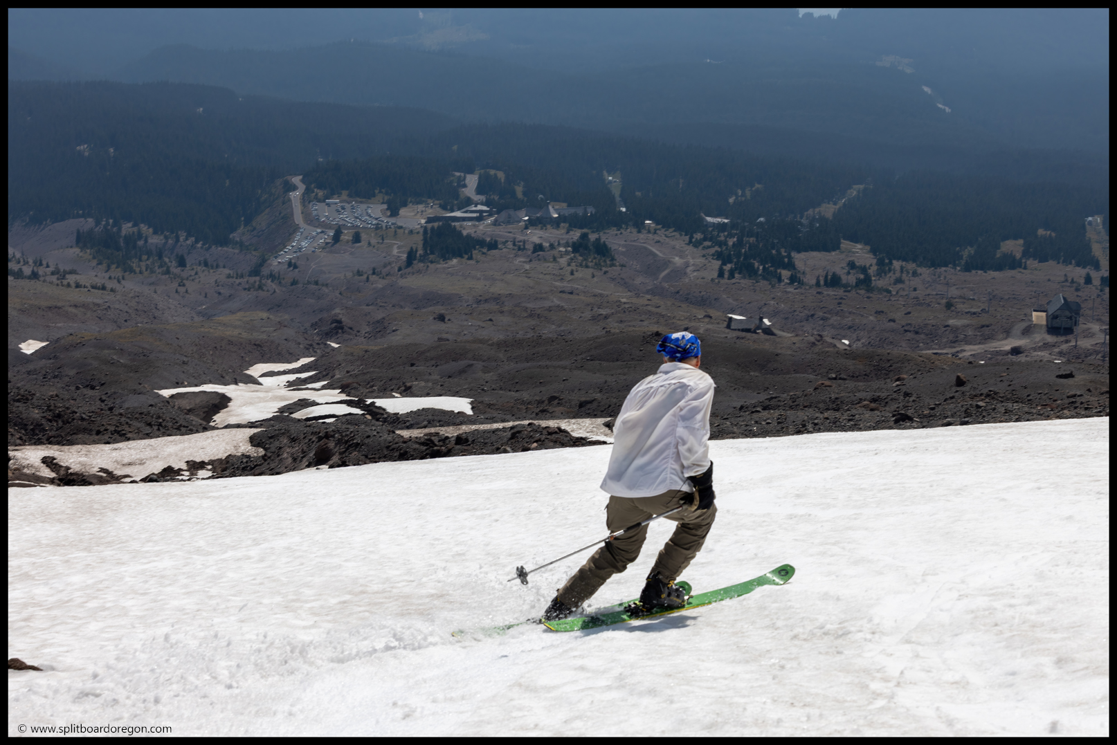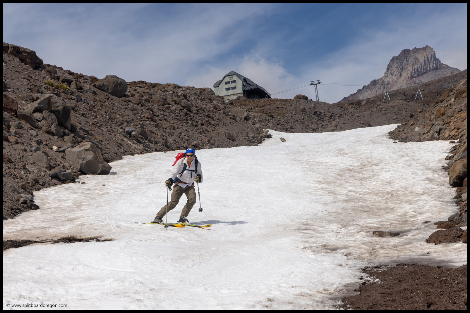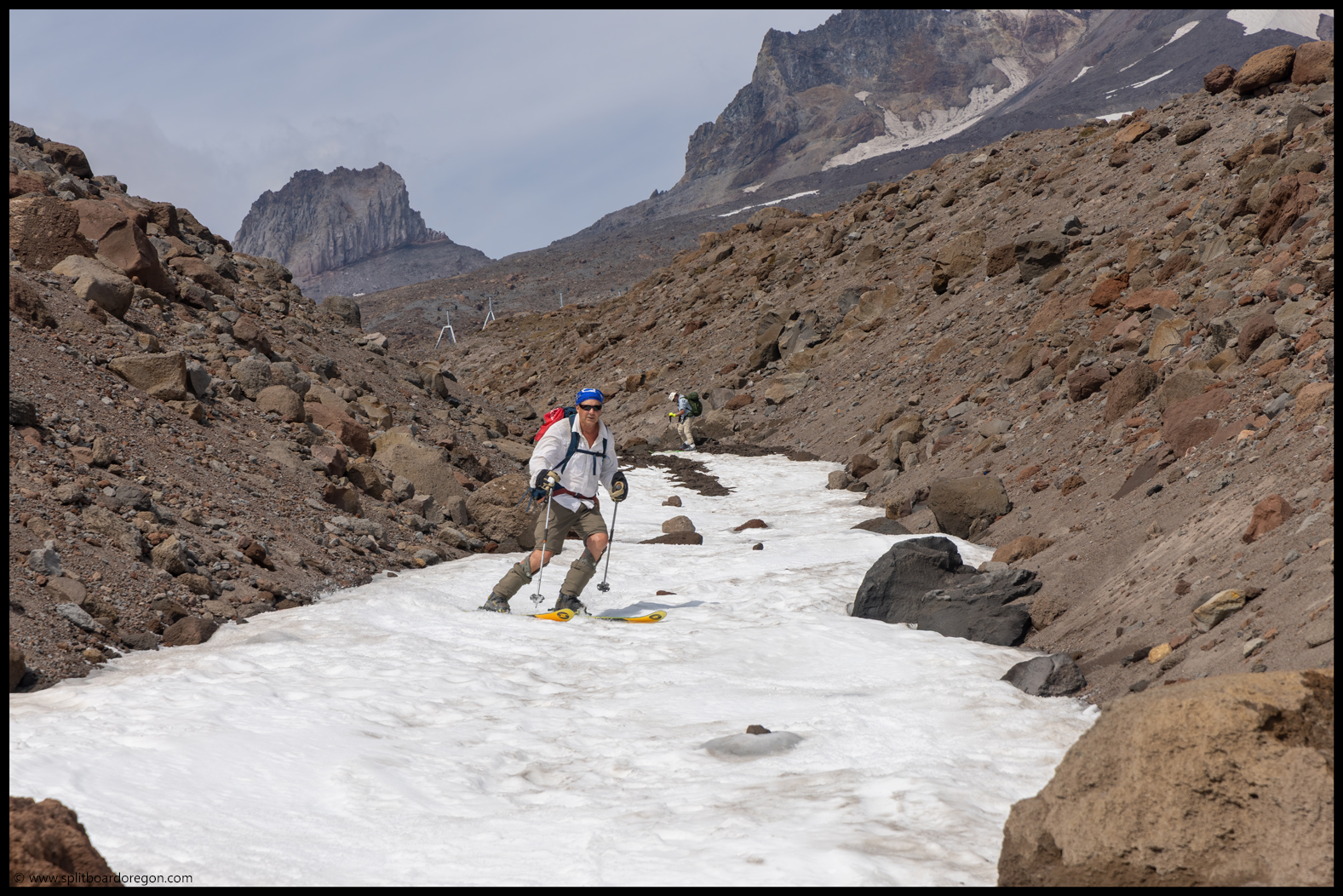 Once we made it to the Palmer Canyon, it was a short hike down to the snow below, and soon we were back to sliding. The turns were decent all the way down, and we had to pull the skis a few hundred above the Silcox and then walk down to the last patch of snow in the Mile Canyon.