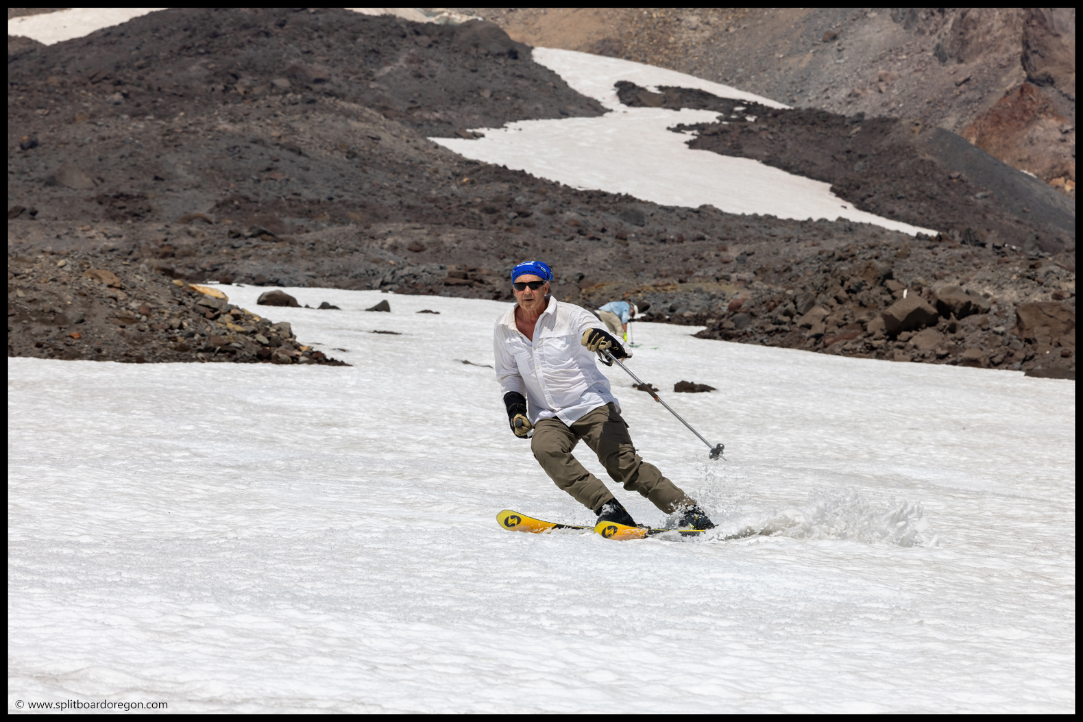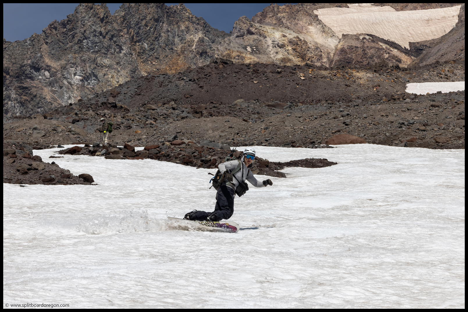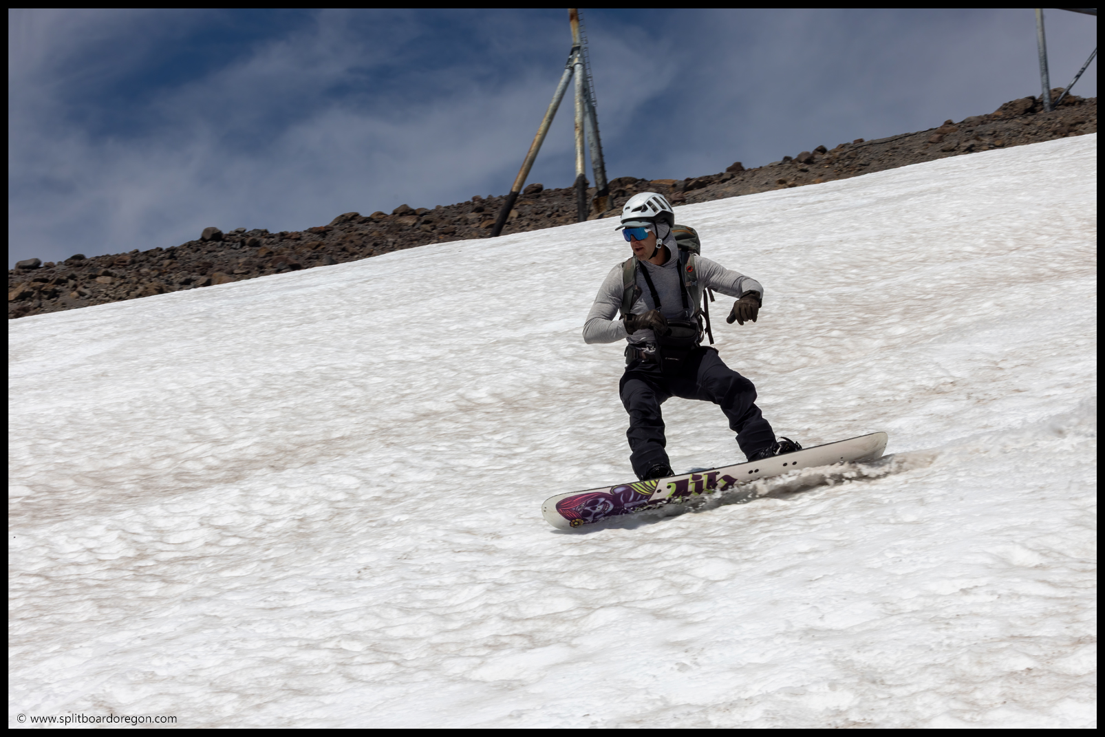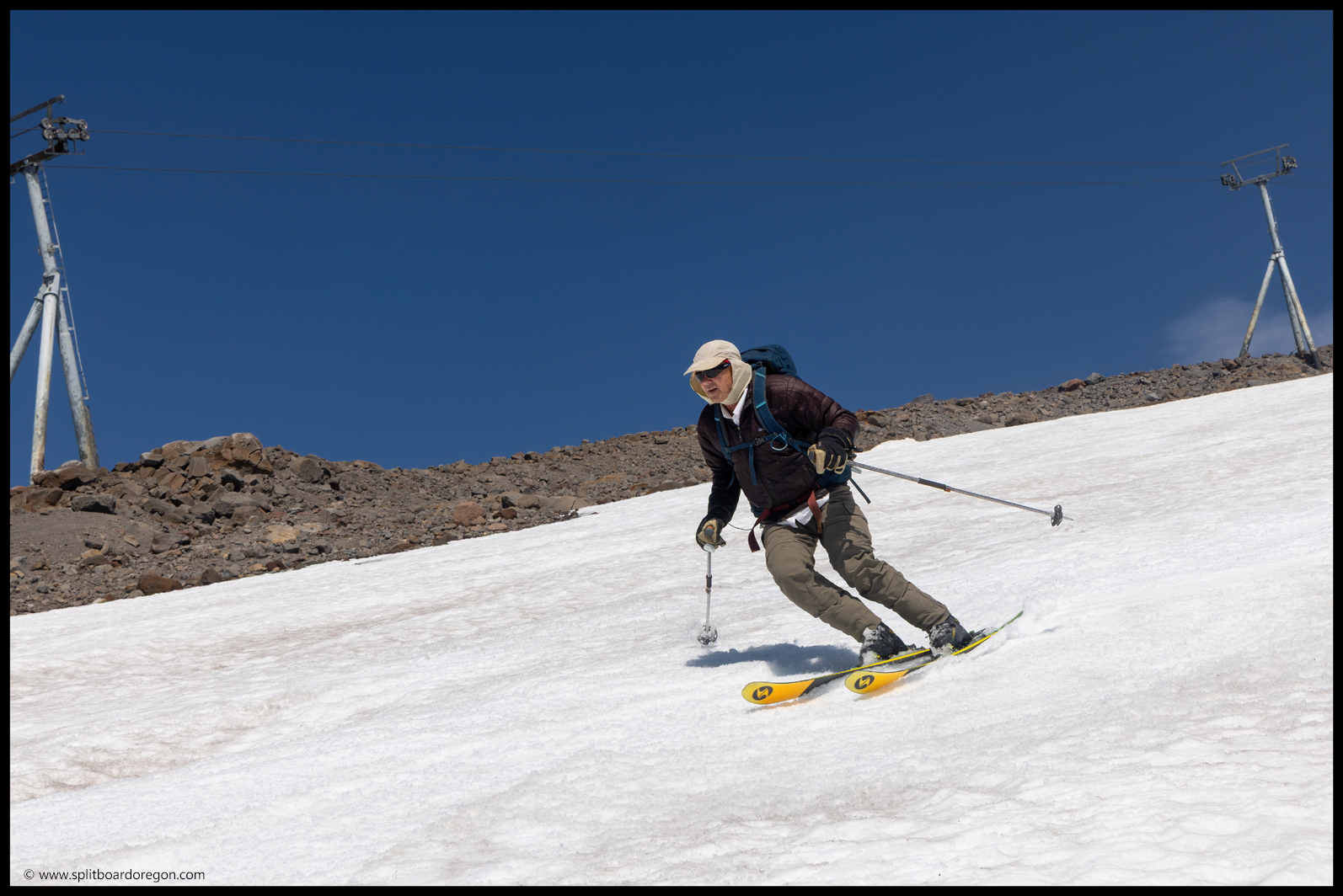Once we made it to the Palmer Canyon, it was a short hike down to the snow below, and soon we were back to sliding. The turns were decent all the way down, and we had to pull the skis a few hundred above the Silcox and then walk down to the last patch of snow in the Mile Canyon.