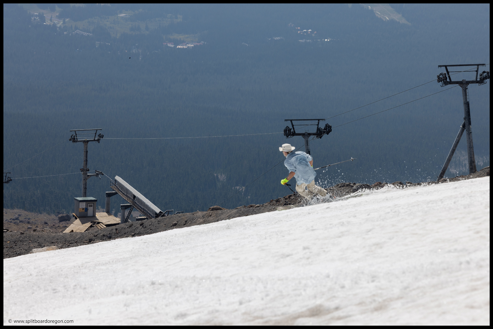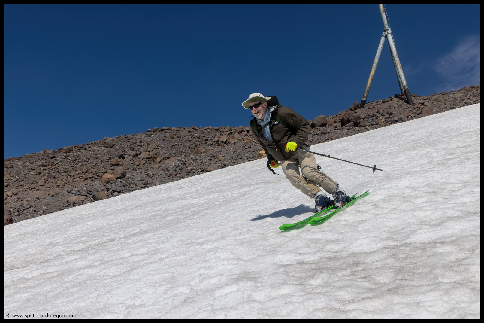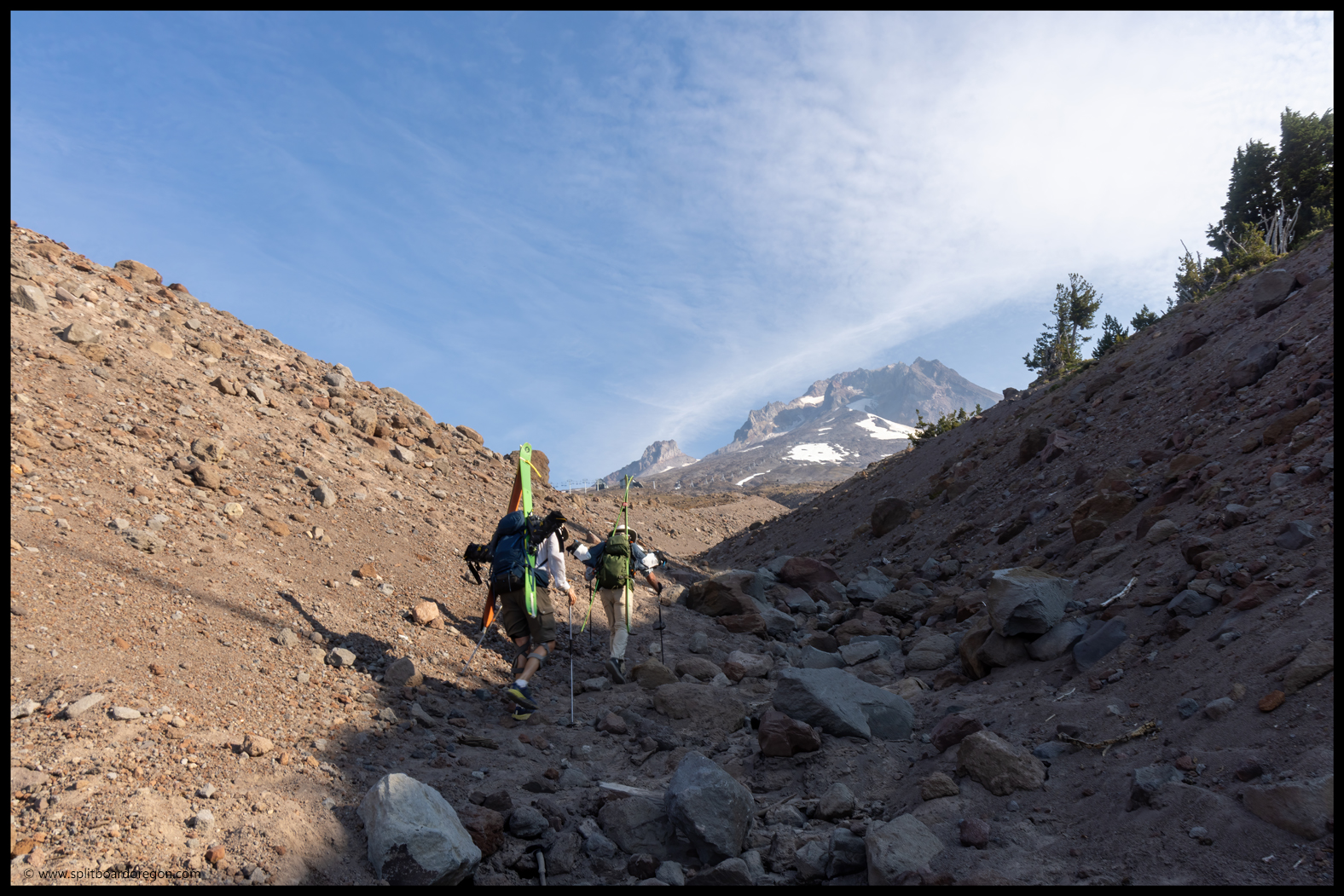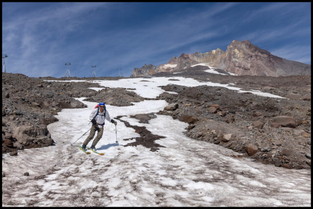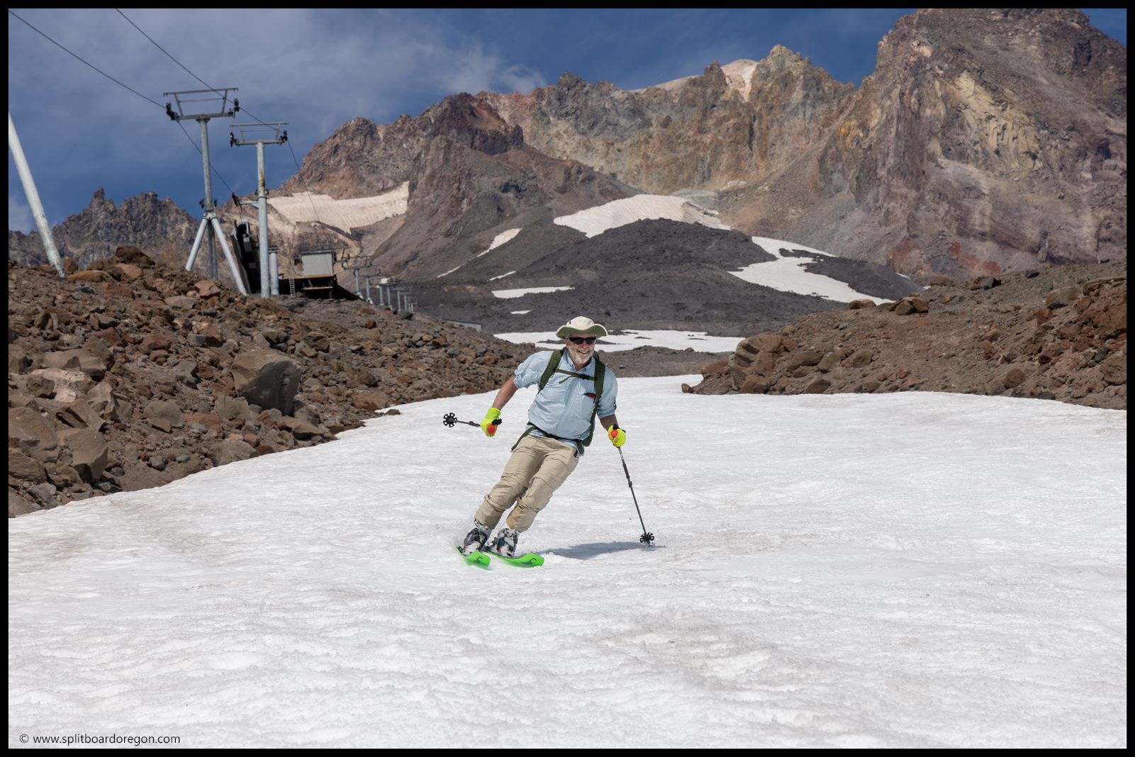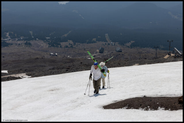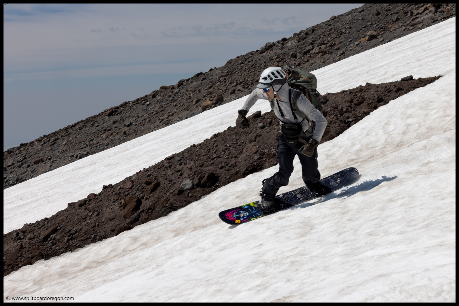Once we made it to the Palmer Canyon, it was a short hike down to the snow below, and soon we were back to sliding. The turns were decent all the way down, and we had to pull the skis a few hundred above the Silcox and then walk down to the last patch of snow in the Mile Canyon.