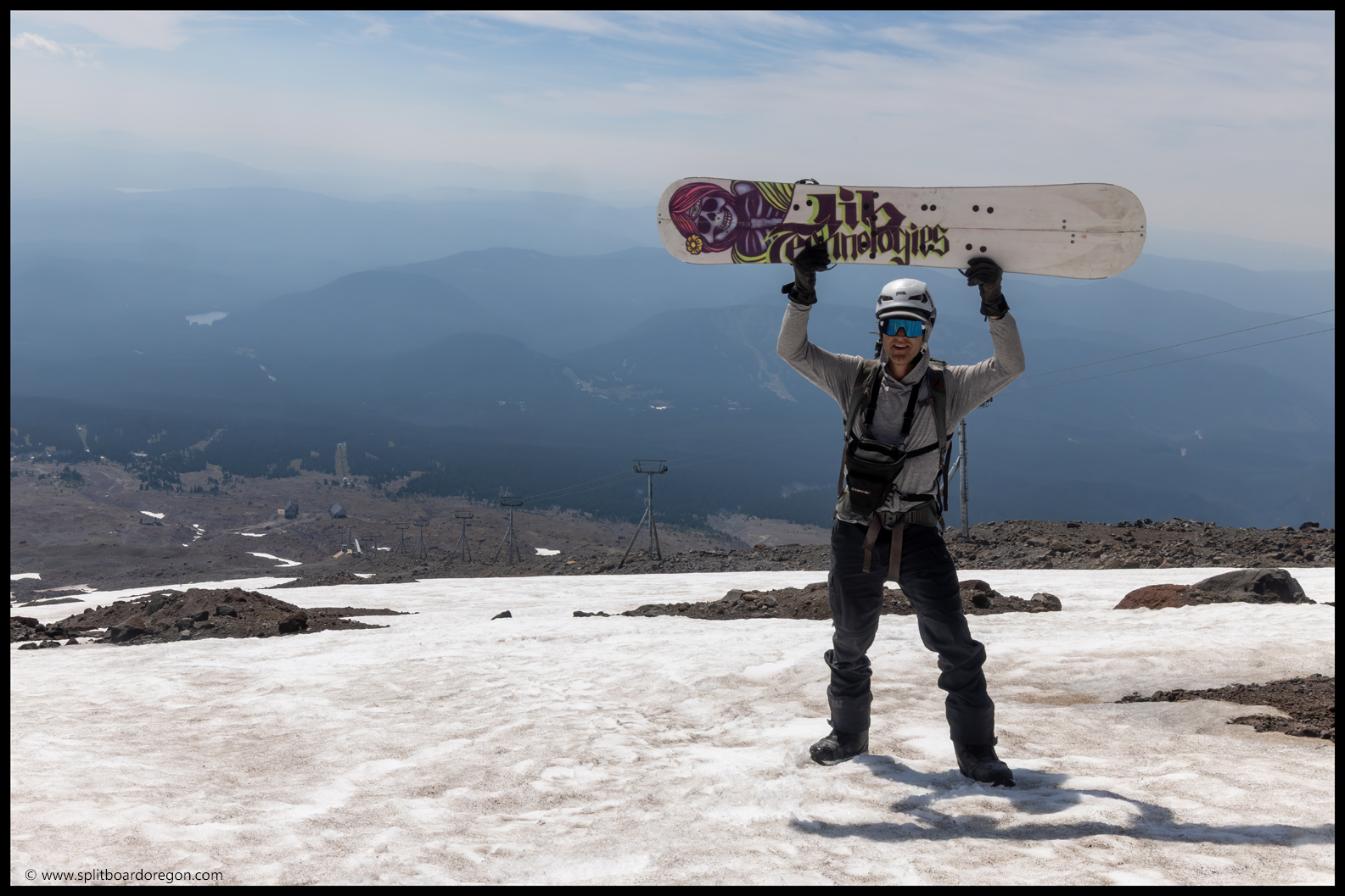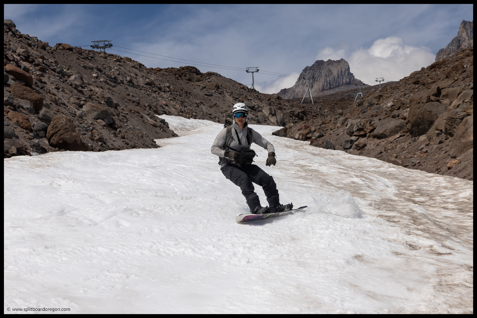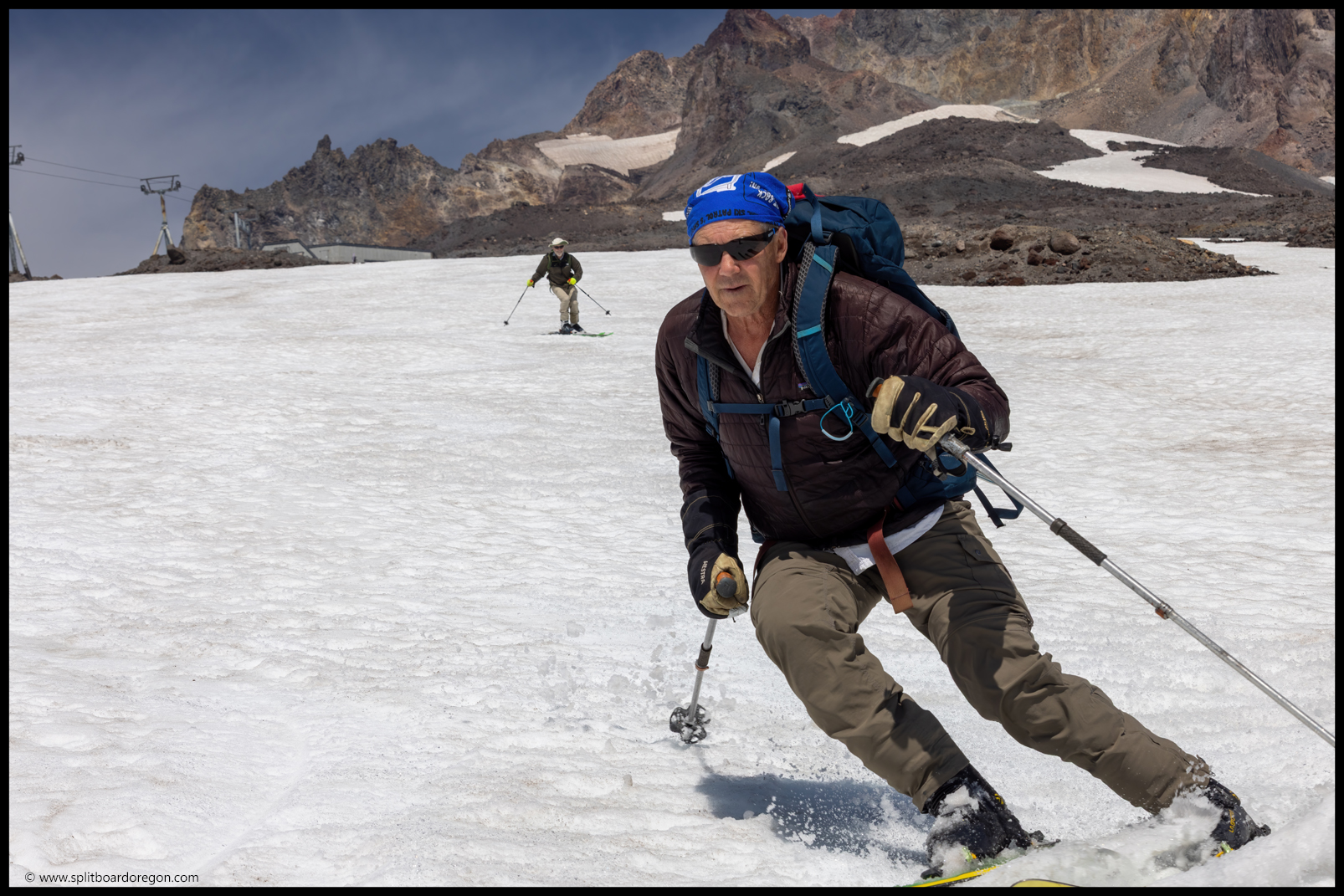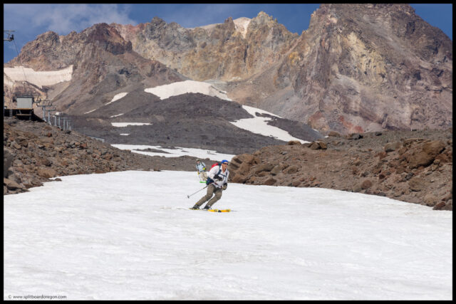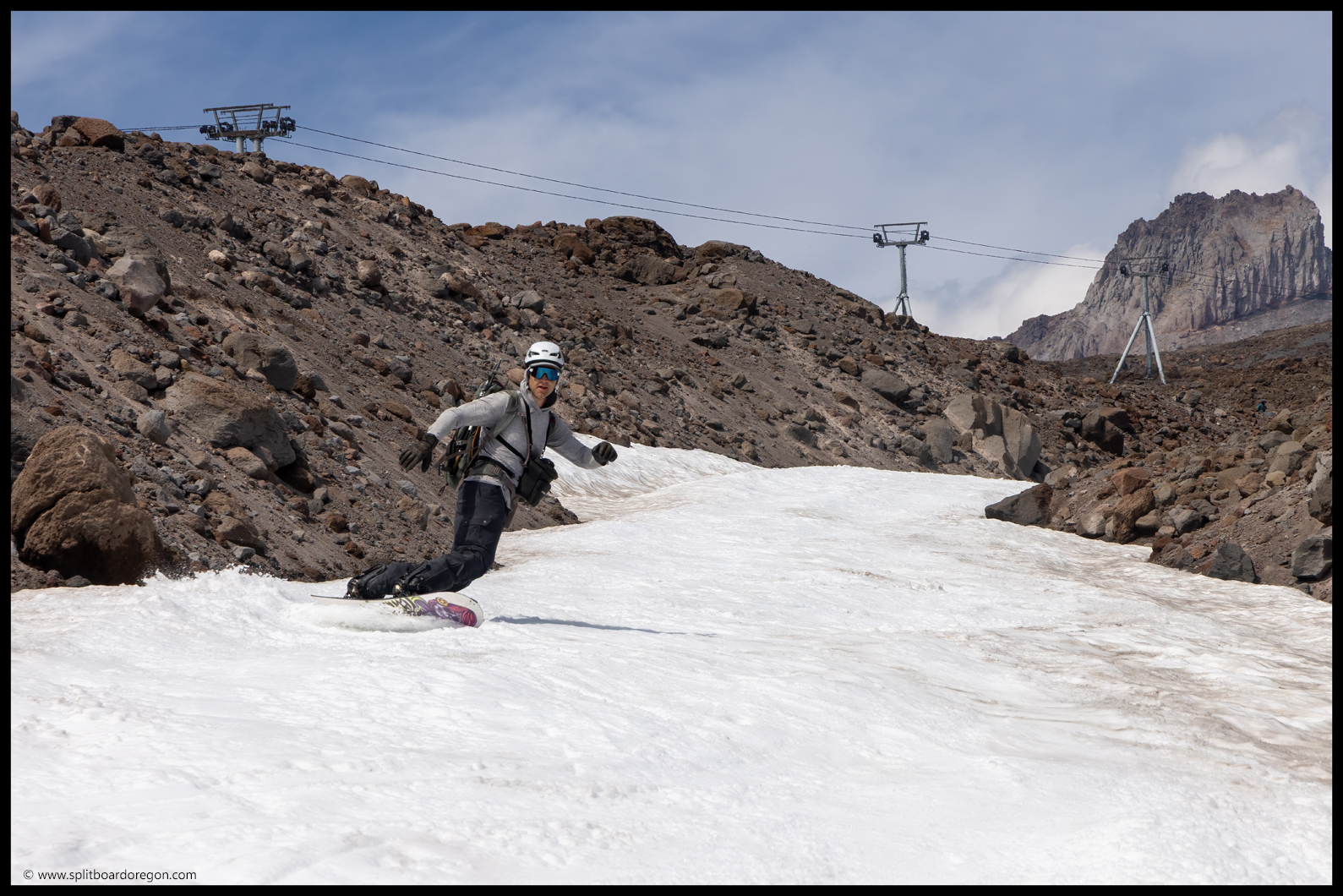 Once we made it to the Palmer Canyon, it was a short hike down to the snow below, and soon we were back to sliding. The turns were decent all the way down, and we had to pull the skis a few hundred above the Silcox and then walk down to the last patch of snow in the Mile Canyon.