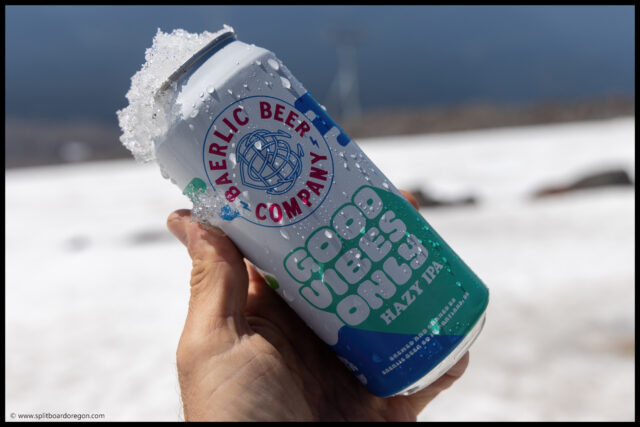 At the bottom of the Palmer, we donned skins once more and headed up. As we made our way about halfway up the Palmer, a bunch of other folks emerged below and it looked like, and sure enough was, the same crew out of Washington that we saw last year in September. It didn’t take long, and we were at the top of the snow on the Palmer, about 50-100 feet below the actual top station. The first order of business was to get the beer on ice, which I did promptly. A few minutes later, it was cold, and the Good Vibes Only hazy IPA from Baerlic Brewing hit the spot.
