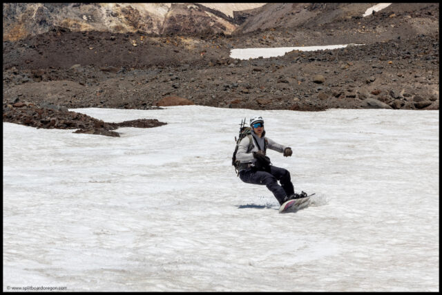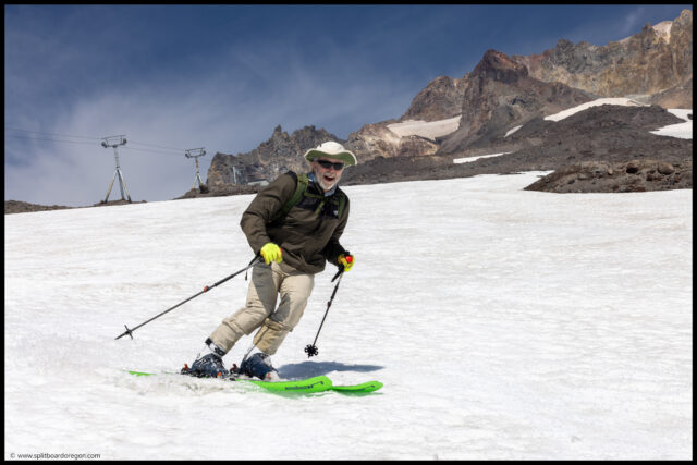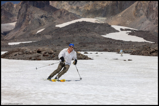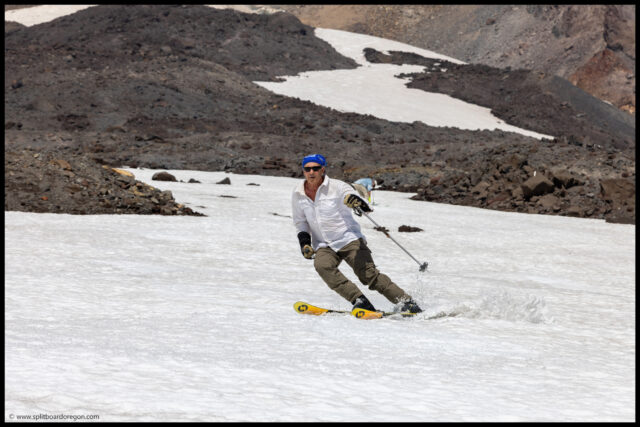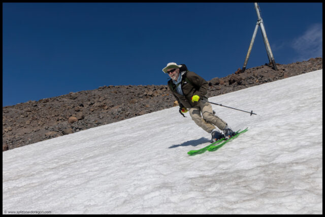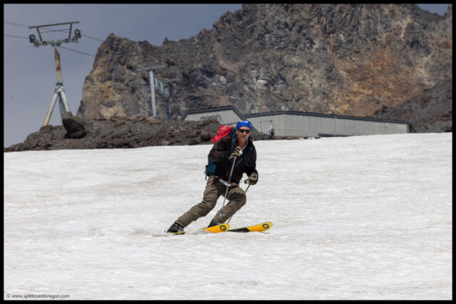 About halfway down, we saw another skier heading up and it was a familiar face – fellow turns-all-year enthusiast Amar Andalkar. We stopped and caught up with Amar for a few minutes, and chatted about our last outing when we skied together on the Avalanche Glacier Headwall on Mt Adams. After awhile, we continued on down while Amar continued on up, and made our way down to the final patches of snow before the turns were completely through.