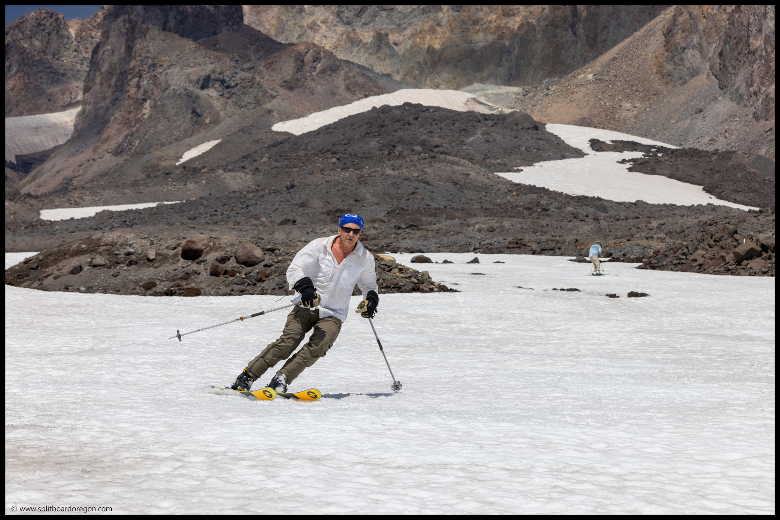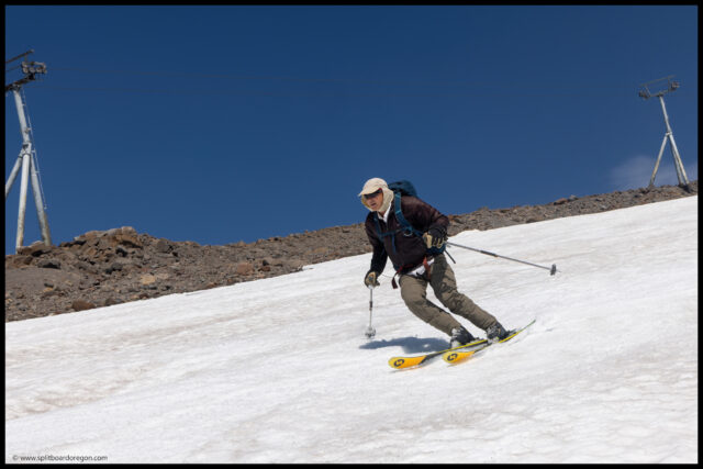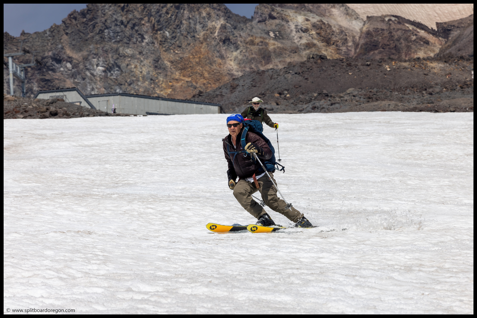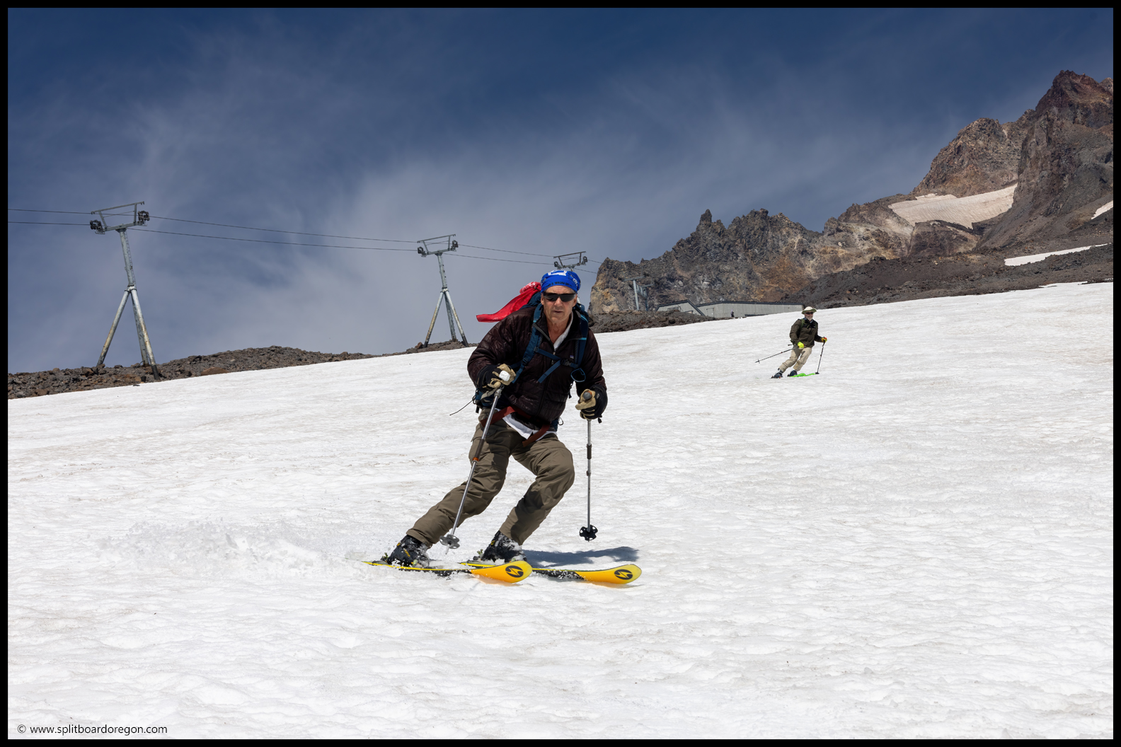 The skiing was really good on the second lap, and not wanting to be quite done, we decided to ditch the skins and packs and head back up for a half lap to the mid-section of the snowfield where the snow was skiing the best.