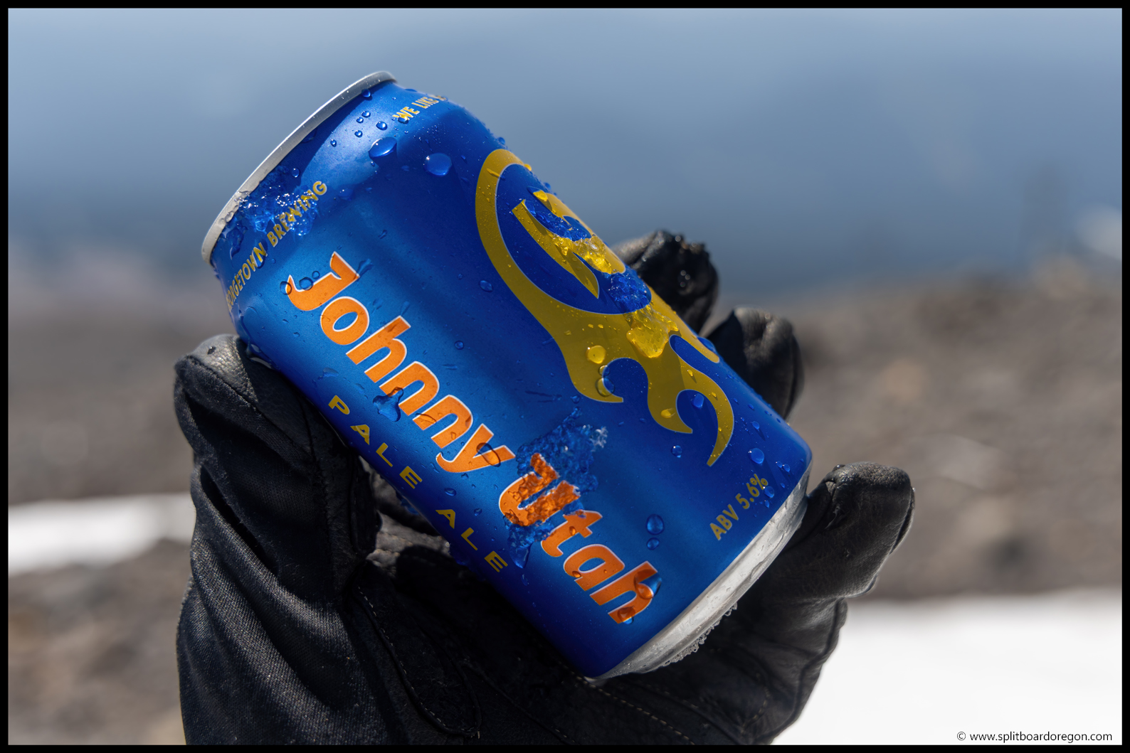 At the bottom of the snow, we regrouped and donned skins to head back up for another lap. As we were getting ready to head up, a group of three skiers and riders came down, and one of the skiers was Naoto, a friend of Joe and Dan’s and former patroller from Willamette from many years back. We hung out and chatted with him and his buddies for awhile, and it seemed like the perfect time to snap a picture of my second beer I’d brought up the hill. It was a refreshing Johnny Utah Pale Ale from Georgetown Brewing Co. After capturing the picture, I put it back on ice to enjoy later when we were done with the Palmer.