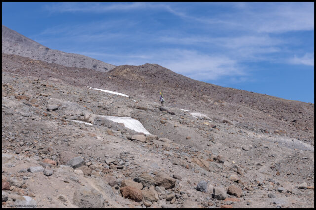 From the end of the snow, it was a longer than normal hike back to the mid-station. It was a bit depressing how much snow had melted since August, and it was beginning to look like getting October turns on the Palmer might be quite a challenge. Below is a picture of Dan looking quite small as we made our way over to the Palmer Canyon.
