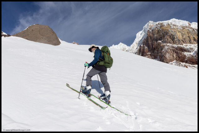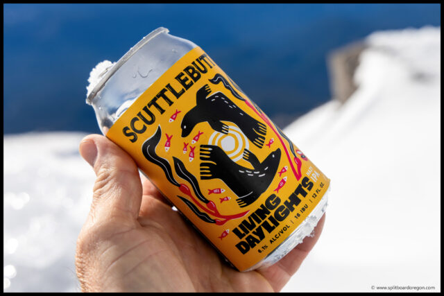 At any rate, we skinned almost to Beer Rock, and then switched to booting for the final section where we decided we’d climbed high enough for the day and would call it. The snow higher up looked more wind effected and firm, so we enjoyed the views and a beverage while removing skins and getting ready to ride. My beer of choice for the ski was a easy drinking Living Daylights IPA from Scuttlebutt Brewing that I’d picked up back in late summer while in Everett, WA to attend the pacific northwest ski patrol convention. It hit the spot and after finishing our beers we were ready to ride.