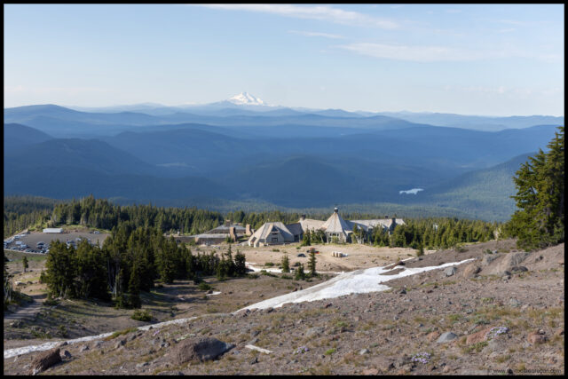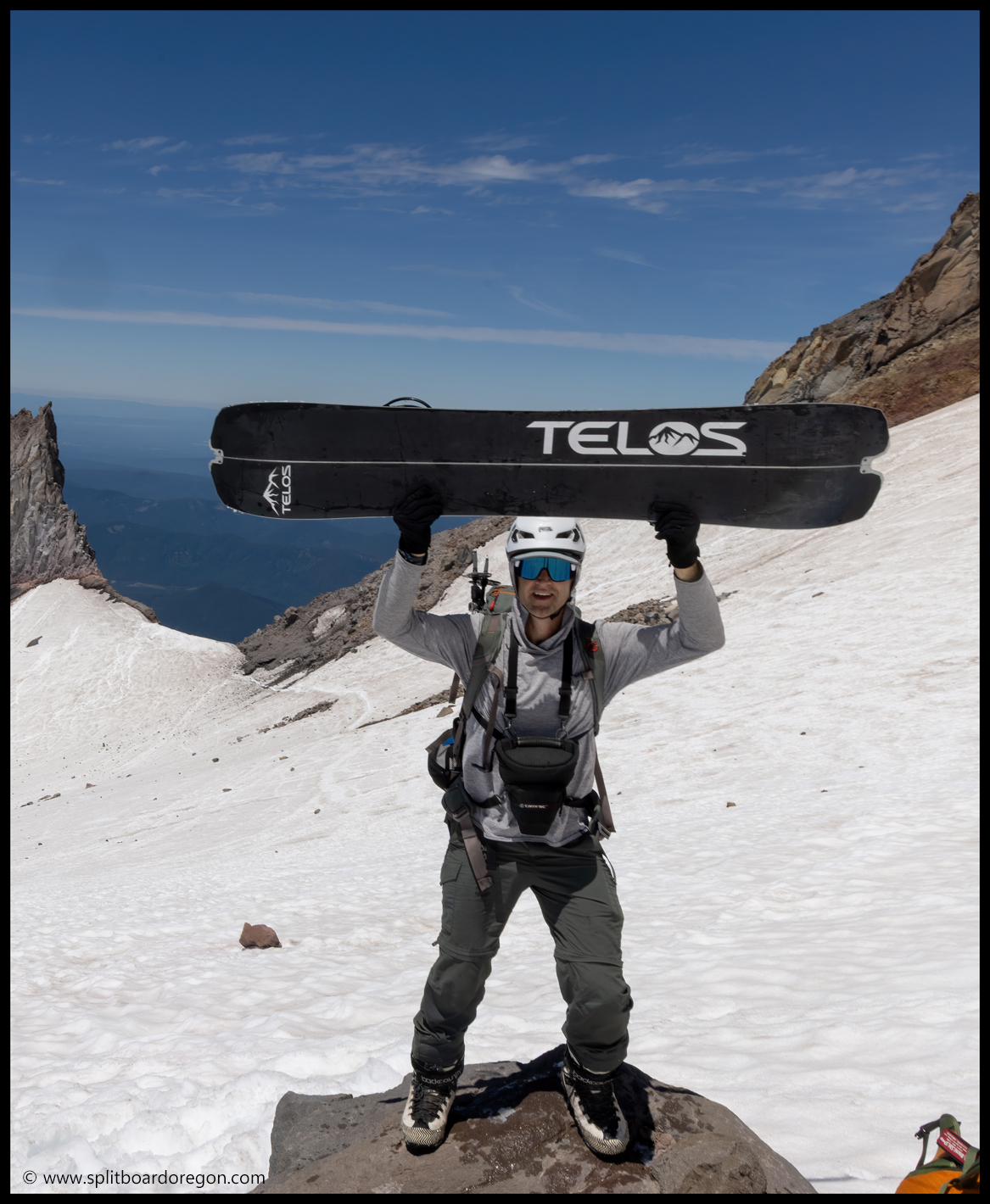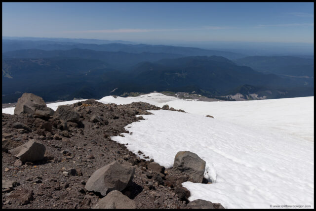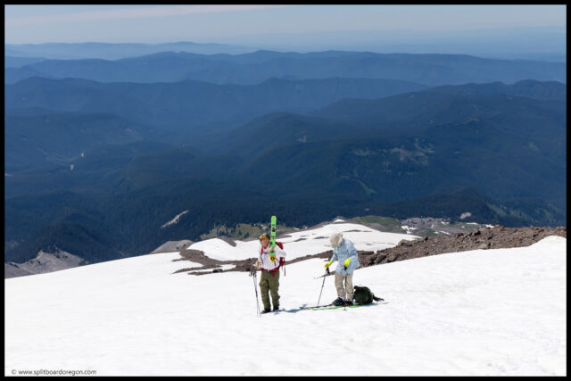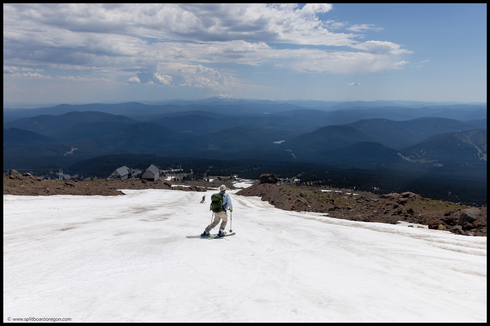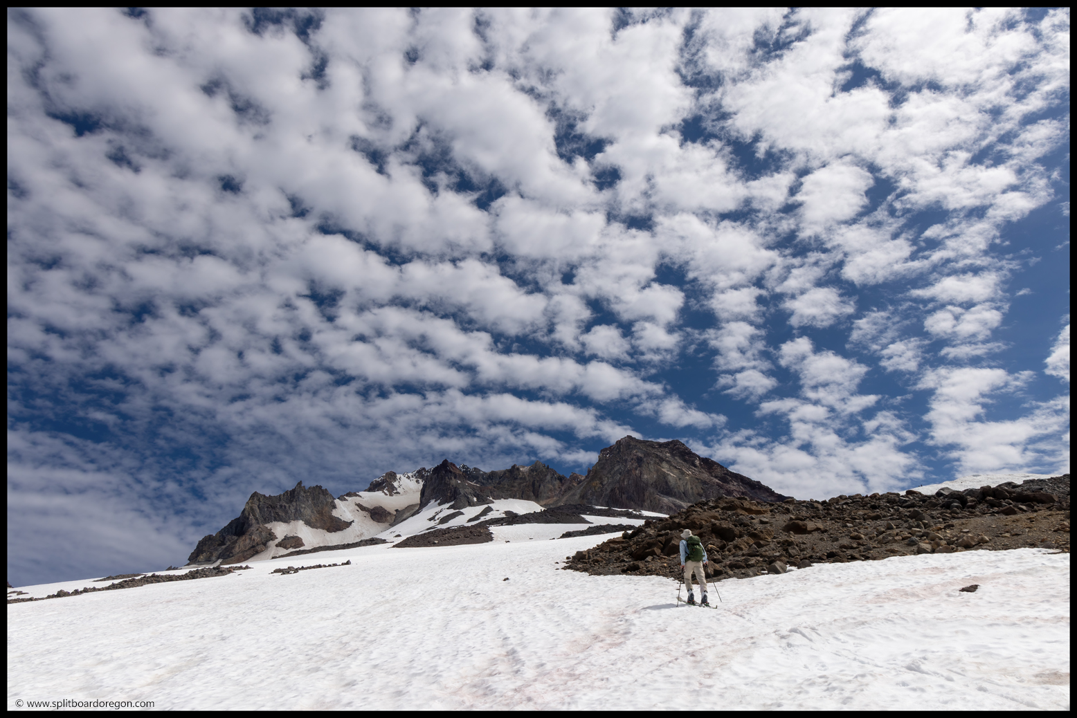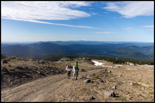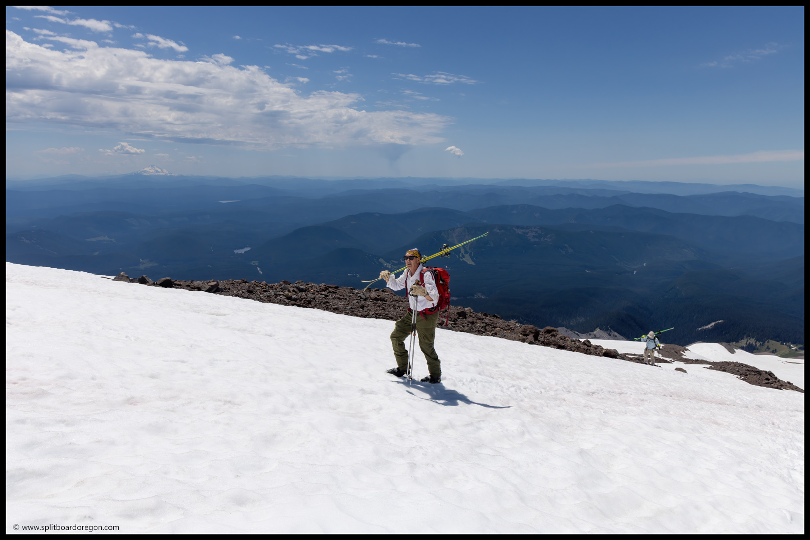 The mountain was looking more like August 1st than July 1st, but we were happy to be getting out on the snow. We shouldered our packs and made the walk up to Silcox on the road. Several cars past us on the hike up, and when we got to the hut, we found out there was a promo shoot happening for some clothing outfit.