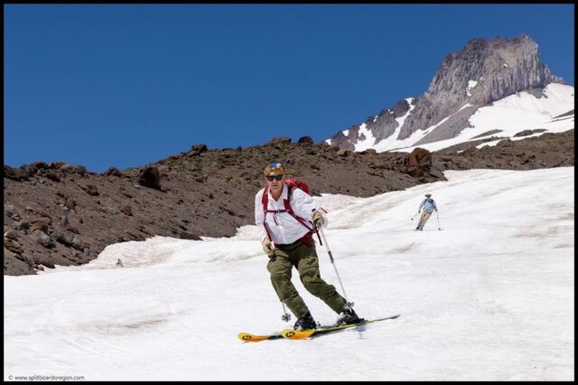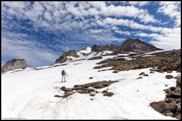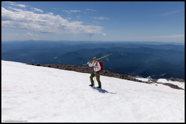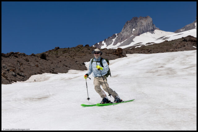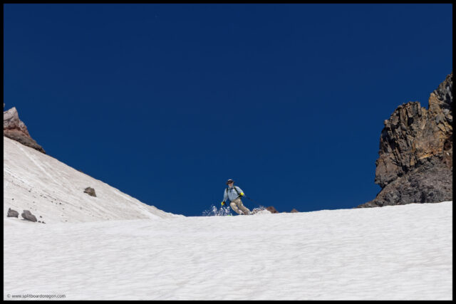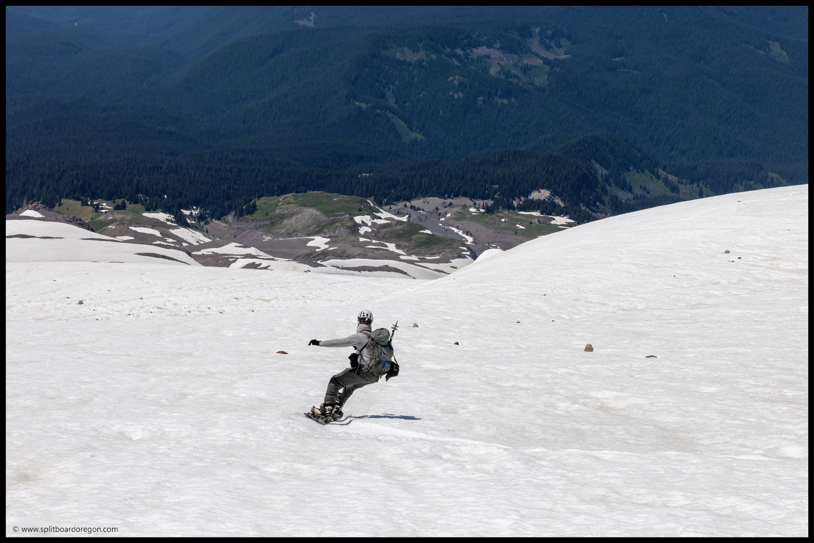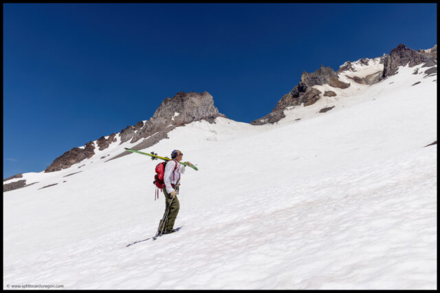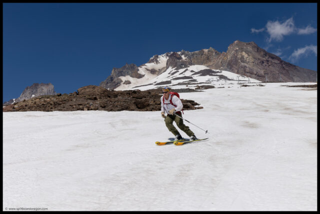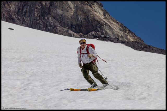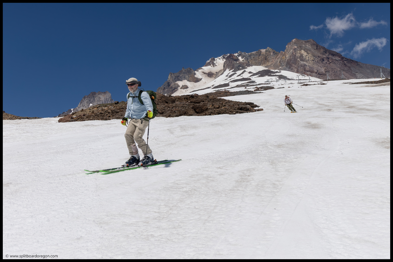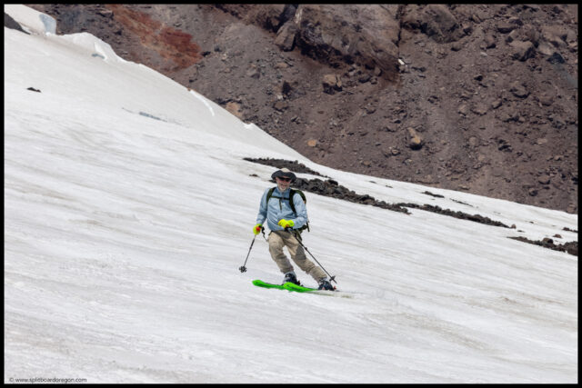 We party skied down the upper Ziggy to our usual entry point around 8500 feet in elevation. From there, given the stickiness of the snow and the warm temps, we decided to forgo skiing lower down on the Zigzag and instead head over to the Palmer. Getting off the Zigzag required taking off the skis and doing a bit of booting, but nothing like the usual booting later in August or September.