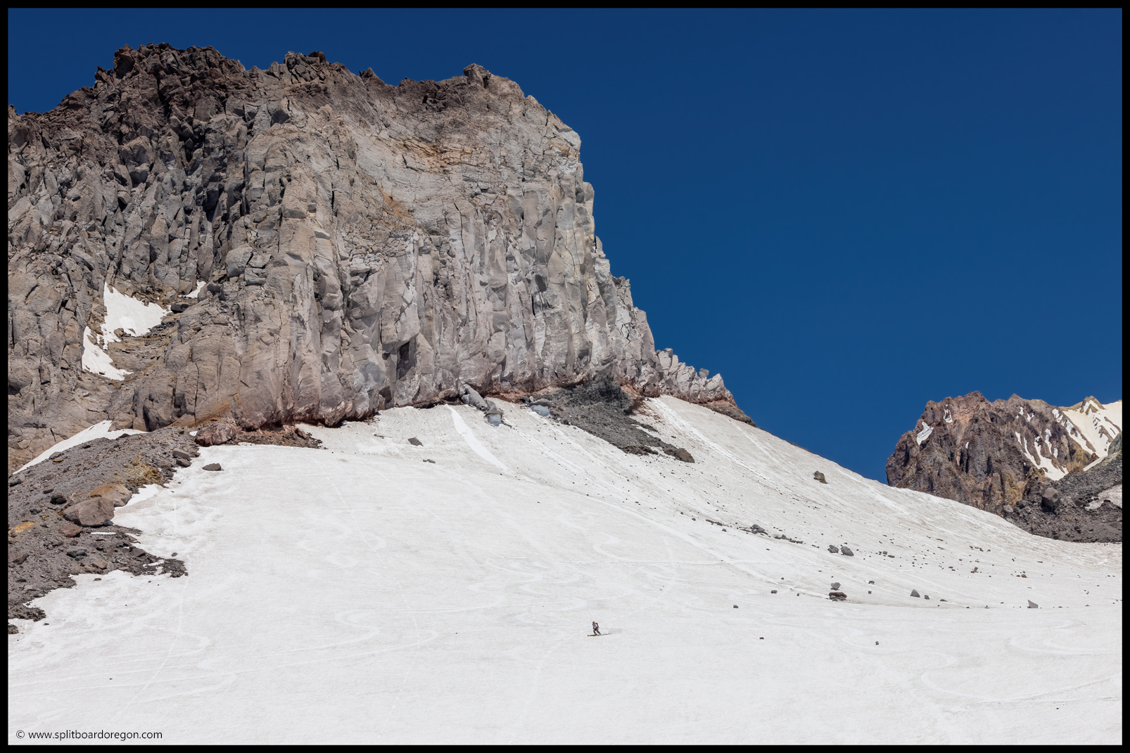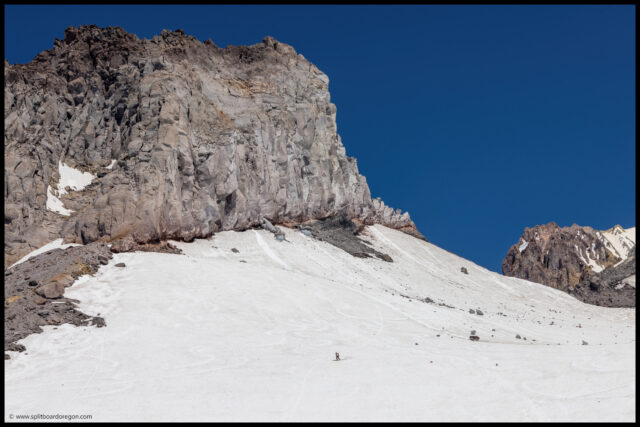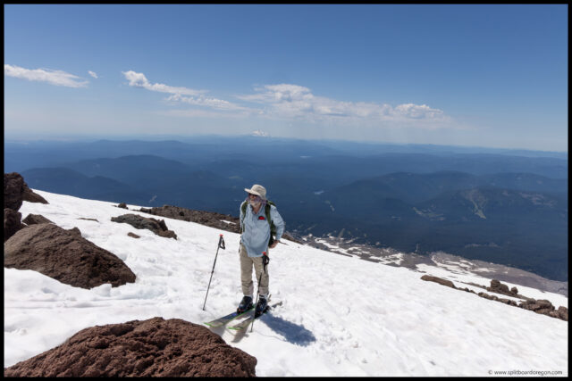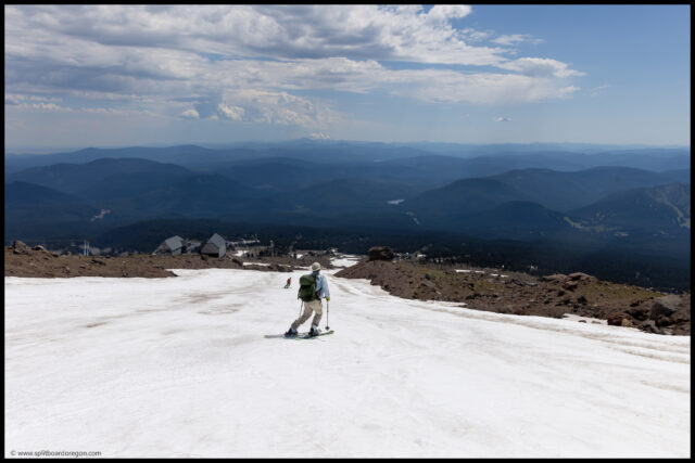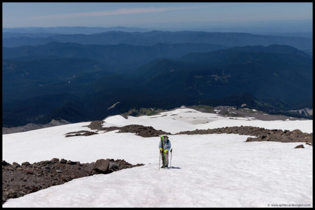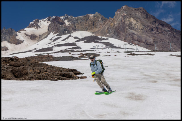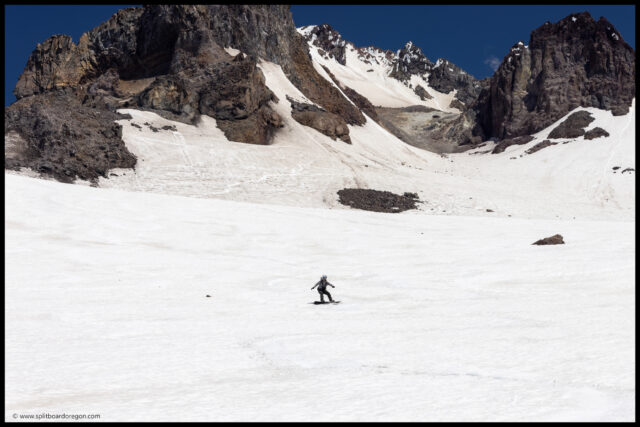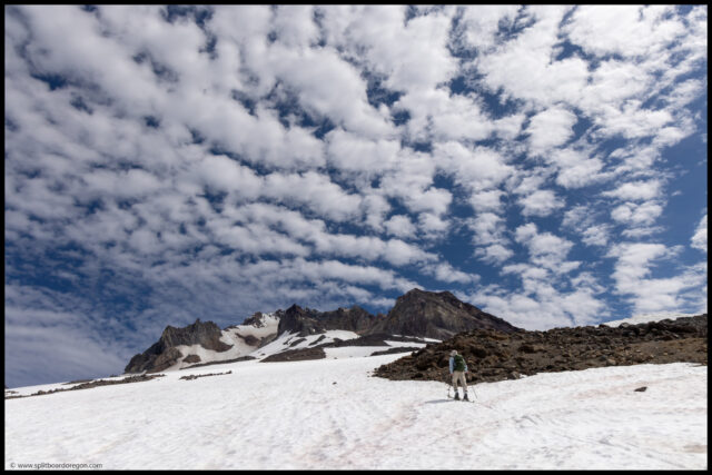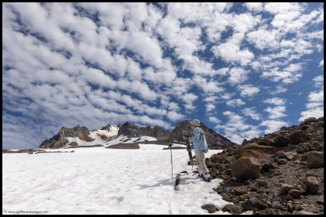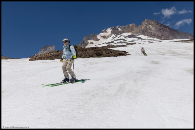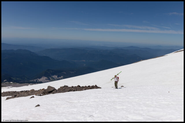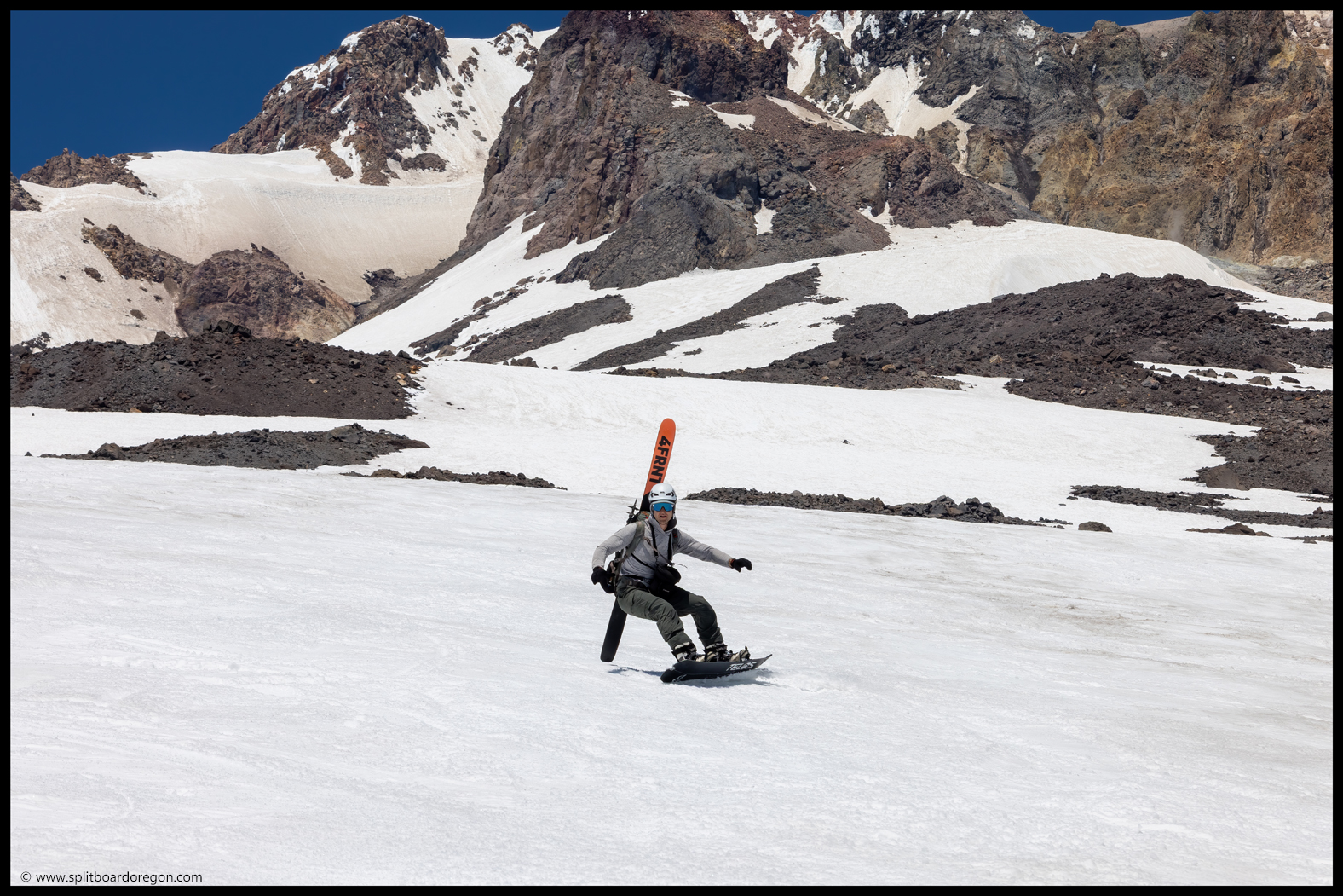 We party skied down the upper Ziggy to our usual entry point around 8500 feet in elevation. From there, given the stickiness of the snow and the warm temps, we decided to forgo skiing lower down on the Zigzag and instead head over to the Palmer. Getting off the Zigzag required taking off the skis and doing a bit of booting, but nothing like the usual booting later in August or September.