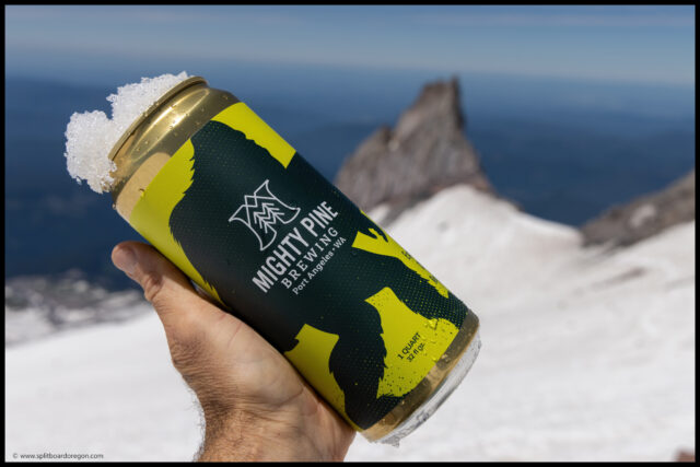 We worked our way up and over to the Zigzag, and skinned up to a point above Illumination Saddle that afforded a good view. The snow on the Zigzag wasn’t the best quality, being a bit runneled, and it was quite warm. We called it near the base of Crater Rock, and it was time to step out of our bindings and get a beer on ice. My beer of choice for the day was a whopper of a can – a 32 oz. hazy IPA from Mighty Pine Brewing that I picked up a few weeks earlier in Port Angeles while on a trip there with family to visit the Olympics and surrounding area. I snapped a picture of it, but then put it back in my pack to enjoy for later at the top of the Palmer. If you are in the Port Angeles area, it definitely worth checking these guys out — their beer is awesome and they are super good people.